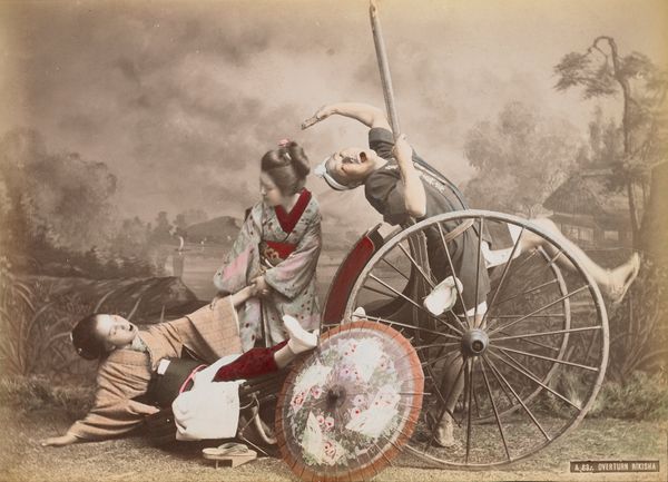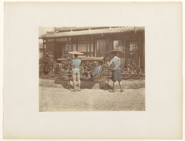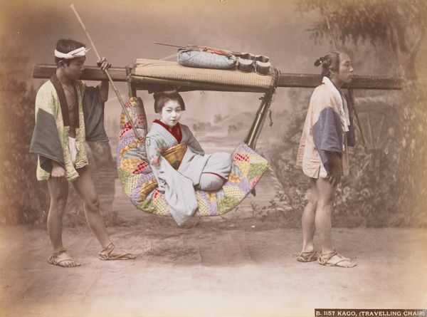 This hand-colored albumen print, "Japanese Woman in Carriage," by Suzuki Shin'ichi, captures a moment laden with cultural symbolism. The rickshaw itself, a relatively new invention at the time, speaks to shifting social structures. Yet the woman's serene pose, coupled with her elaborate attire, evokes the timeless ideals of feminine grace. Consider how such displays of status echo through art history, from ancient Roman portraits of patrician women to Renaissance paintings of noble ladies. The subtle power dynamic—the woman seated, the man pulling—recalls ancient motifs of conquest and subjugation, yet here, softened by a distinctly Japanese sensibility. The very act of being transported, elevated, touches upon archetypal desires for transcendence, a theme as old as civilization itself. This photograph becomes a mirror reflecting our collective fascination with status, beauty, and the intricate dance of human relations.
