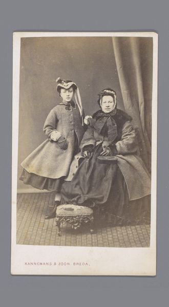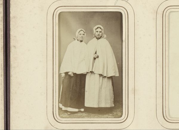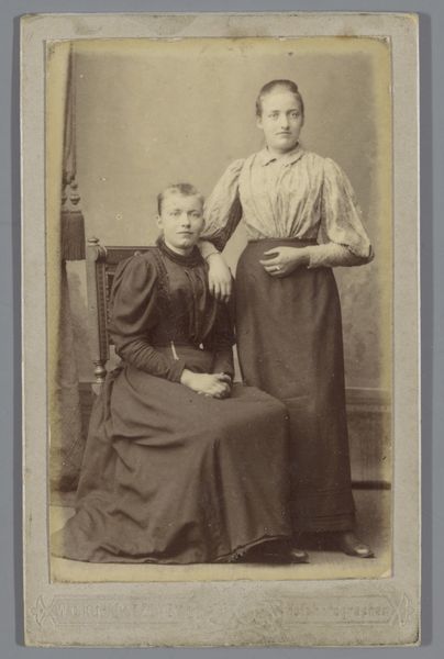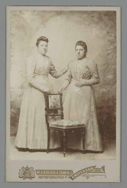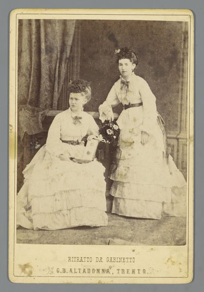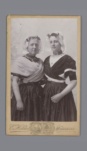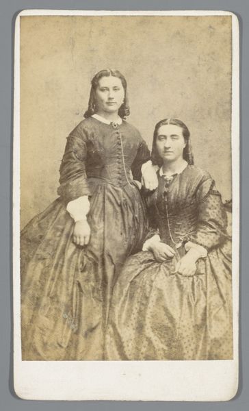 This photographic print captures two girls in white dresses, created by J. Van Crewel Jeune. The sepia tones and soft focus evoke a dreamlike atmosphere. It's easy to get lost in the details: the delicate lace, the folds of fabric, the girls' composed expressions. There's a stillness to the image, a sense of formality. Yet, if you look closely at the carpet in the lower part of the image, you'll notice a faint pattern, a subtle reminder of the world outside this carefully constructed scene. I love how the textures, the smooth skin against the textured dresses, add depth and complexity. It reminds me of the work of Julia Margaret Cameron, another photographer who experimented with light and shadow to create ethereal portraits. Like Cameron, Van Crewel Jeune invites us to look beyond the surface and contemplate the mysteries of childhood and identity. It leaves me wondering about the girls' lives, their hopes, and dreams. A photograph like this offers no definitive answers, but it does offer a space for reflection and imagination.