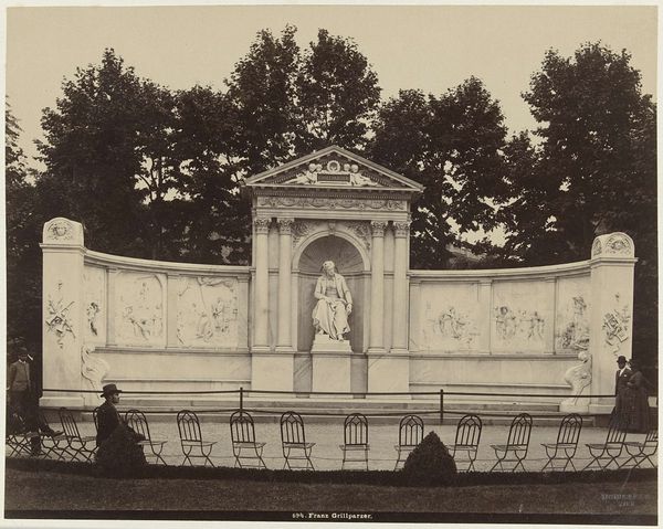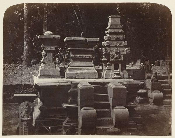 Editor: This gelatin-silver print, taken sometime between 1876 and 1880, presents Salomon Verveer's grave monument within a Jewish cemetery. The photograph is held in the collection of the Rijksmuseum. Visually, what stands out to you? Curator: It evokes a serene, almost solemn atmosphere. The tonal range, those subtle gradations of light and shadow, lends a sense of timelessness. Notice the monument’s geometric structure contrasting with the organic backdrop of the foliage. Editor: Right, I find it quite moving how the hand of man is marked by that worked stone, contrasting so deliberately with the wild, overgrown, grassy plot that the structure is placed within. It seems a constant negotiation of nature versus industry. What do you notice about the material composition and construction of the grave itself? Curator: The monument itself presents as an almost neoclassical form. Observe how the sharp angles and tiered design offer a striking counterpoint to the more naturally formed trees and flora. This conscious construction offers an element of formal order amidst the chaotic aspects of nature's cycle. Editor: Exactly, and thinking of the cycle, I would wager it involved quarrying, transportation, carving – substantial labor and a degree of industrial processing even in the 1870s. And that choice of material – likely limestone or perhaps marble – signifies permanence but also cost, reflecting Verveer's status and the resources available to his family. Consider the environmental factors here also: its vulnerability to weather and eventual decay. It becomes subject to forces of entropy we have only minimal ability to influence. Curator: Intriguing thoughts. Perhaps those dual inscriptions, their geometric form standing apart from the main stone, are intended to provide symbolic layers to the memorial's intention. I'm moved by how they create a symbolic architecture. Editor: Yes, even this early experiment of photography feels timeless in its subject, which is interesting considering the technology was so innovative for its time. Curator: Agreed. It truly encourages introspection on representation, materiality, and remembrance itself. Editor: Definitely, a compelling confluence of social history and artistic execution.