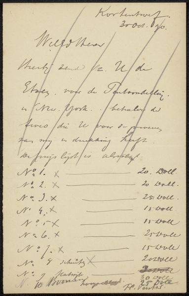 Editor: This drawing, "Aantekening aan Philip Zilcken," made by Carel Nicolaas Storm van 's-Gravesande between 1851 and 1924, is displayed at the Rijksmuseum. It's a handwritten note, a list actually, penned in ink on paper, reminiscent of a personal sketchbook page. I am really drawn to the informal look and how handwriting can express character. What can you tell us about it? Curator: This is a fascinating piece precisely because it *isn't* intended for public display in the way we typically think about art. It offers a glimpse into the artistic infrastructure of the time. We see a list, probably titles and prices, related to what seem like landscape works, focusing on coastal scenes around Scheveningen, reflecting the popularity of this location with artists of the period. What does the act of listing artwork in this manner tell us about artistic production and its connection to the art market in the Netherlands at this time? Editor: I hadn’t considered the economics involved. Is this just about selling landscapes? Curator: Partly. Think about the role of the art dealer like Zilcken, to whom the note is addressed. They mediated between the artist and the buying public, so documenting pricing and potential subjects becomes important for successful business and marketing. Did Storm van 's-Gravesande gain prominence because of these popular coastal landscapes? Editor: So it shows the behind-the-scenes reality of making a living as an artist. I appreciate seeing the tangible connection between art and the society it existed within. Curator: Exactly. By seeing notes and personal ephemera like this, it enriches our knowledge beyond merely considering what hung on gallery walls, offering instead a view into what was happening behind them and who helped make it all happen. Editor: I didn’t expect a simple list could be so insightful. Thanks!
