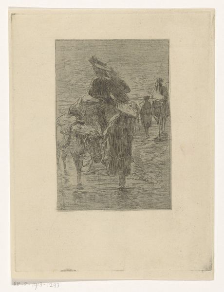 Curator: Eugène Delacroix's "A Nobleman in the Era of Francis I," presents a compelling image. The print, rendered in delicate lines, captures a figure of apparent authority. Editor: My initial impression is melancholy. There’s something about the nobleman’s posture, and the shadowy figures in the background, that evokes a sense of isolation. Curator: Note the artist's use of etching. It allows for fine detail in the nobleman's attire and the horse's musculature, speaking to the material wealth of the era. Editor: The horse is an interesting symbol. Nobility, power, but also restraint. The man holds the reins, but what does that truly signify about his control over events? Curator: Considering Delacroix’s interest in historical subjects, the print engages with notions of power and social hierarchy in 16th-century France. The process itself mirrors the laborious nature of maintaining such structures. Editor: I find myself drawn to the nobleman's gaze. Is it confidence, or perhaps a hint of apprehension? It's a fascinatingly ambiguous representation of leadership. Curator: Indeed. Delacroix presents a nuanced engagement with the past through a combination of technique, material awareness, and representation. Editor: Ultimately, the work poses questions about the burden of authority and the impermanence of power.