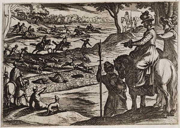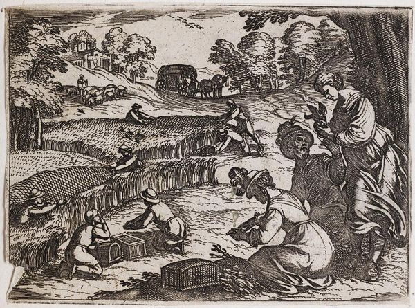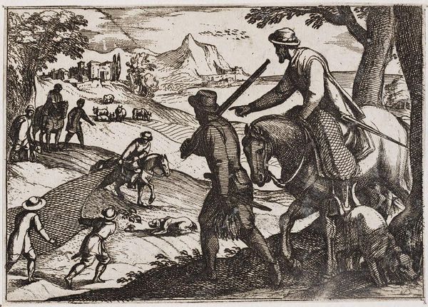 Curator: This is Antonio Tempesta’s etching, “Hunters with Falcons Chasing Wild Birds.” Tempesta, born in Florence in 1555, captured this lively hunting scene with incredible detail. Editor: It feels chaotic, doesn’t it? The frantic energy of the birds, the dogs, and the falconers is almost palpable in the mark-making. Curator: The print medium allowed Tempesta to disseminate such scenes, catering to the aristocratic appetite for representations of their pursuits and status symbols. Editor: And the means of production—the etching process itself—speaks to a fascinating tension. The artist’s hand, mediated by acid and metal, to create images consumed by the elite… fascinating! Curator: Indeed, the political and social dimensions are key. Falconry was a privilege. Editor: Seeing the labor embedded, from the artist’s studio to the hunt itself, makes me rethink its value. Curator: Well, that's certainly one way to view it. This piece allows us to glimpse into the lifestyle of privilege in the 16th century. Editor: And for me, it's a lens on how material culture shapes our understanding of labor and leisure.
