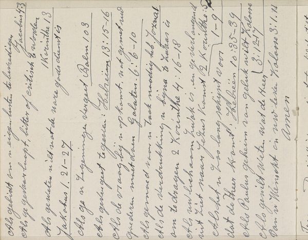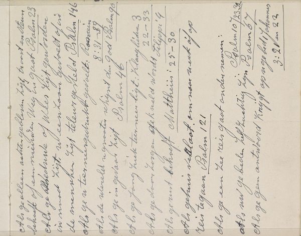 Here we see a page from Carel Adolph Lion Cachet's "Fragmenten uit psalmen," made without a specified date and medium. Lion Cachet was a Dutch artist born in 1864 and died in 1945. This piece, which appears to be a page from a sketchbook, gives us a glimpse into the artist's devotional life, offering a space to reflect on themes of faith, identity, and solace. Lion Cachet's choice to record these fragments suggests a deeply personal connection to the text. The artist blurs the boundaries between the personal and the divine. The Psalms, deeply rooted in cultural and religious traditions, often provide a medium for expressing a range of human emotions, from joy and gratitude to sorrow and lamentation. Here, the artist develops an alternative narrative that transcends tradition and speaks to the timeless human experience of seeking comfort and meaning in the face of life's trials. It is an intimate, emotional, and personal reflection of societal issues.