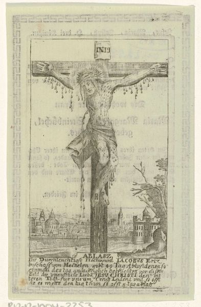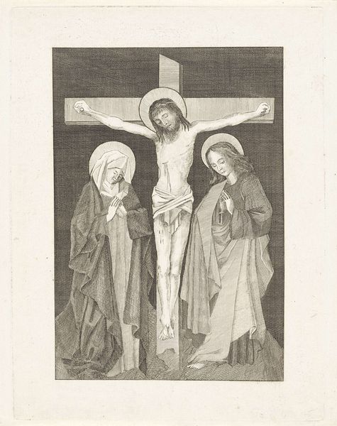 Editor: So, this is "Christ on the Cross between John and Mary," a pencil and paper drawing made sometime between 1821 and 1879 by jonkheer Isaac Lambertus Cremer van den Berch van Heemstede. It’s a striking image, stark, almost unfinished. The lines are so delicate, but the subject is so monumental. What stands out to you in this piece? Curator: It’s fascinating how the artist chooses pencil, such a readily available and accessible material, to depict such a loaded scene. Consider the socio-economic implications. Was this accessibility a conscious choice? Perhaps reflecting a specific devotional practice aimed at a broader audience beyond the traditionally wealthy patrons of grand religious art? Editor: That's an interesting point! I hadn't considered the social aspect of the material itself. Curator: And look at the paper. What kind of paper is it? Is it mass-produced, or something more bespoke? The very act of sketching, rather than painting, invites a different kind of labor and perhaps a quicker consumption cycle. Are we looking at a study, a preparatory work meant for a different end, or is it the finished piece? Editor: I'm not sure about the paper type. If it was meant to be something "quick" would that suggest that it was for mass consumption and, if so, why? Curator: Possibly not for mass *consumption*, but certainly hints to something more immediate and less mediated; pencil enables quick correction. Look too, at the implied narrative around the cross and skull, the setting and implied consumer. How are the materials helping communicate and convey the emotion versus monumental paintings during this time? Editor: So, by focusing on the materials, we can see how the artist's choices reflect a particular approach to the subject matter and potentially offer commentary on society, labour, and artistic consumption itself? Curator: Precisely. It moves beyond mere aesthetic appreciation and into understanding the artwork as a product of its time and its maker's relationship with the means of production. Editor: I’ve learned so much! I'll never look at a simple pencil drawing the same way again. Curator: Exactly! Seeing the art and labor helps reframe the importance of it as a reflection of social dynamics.