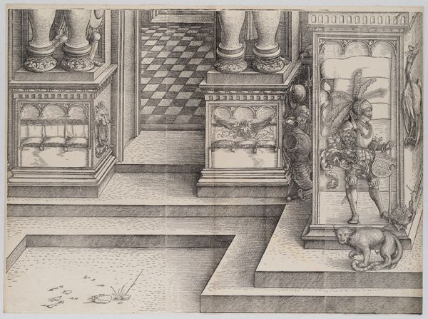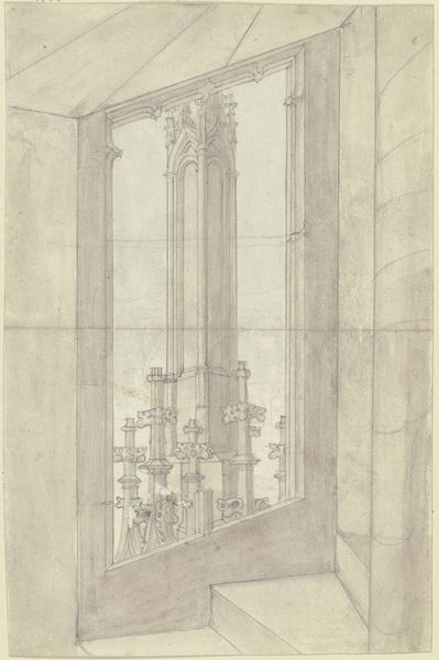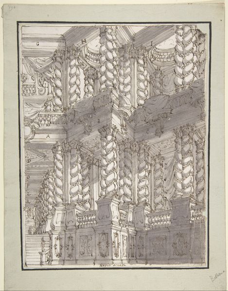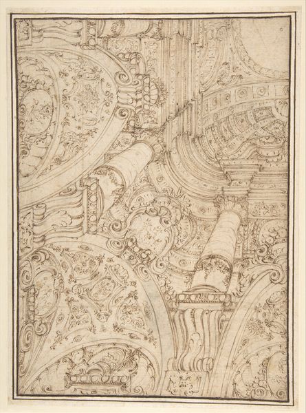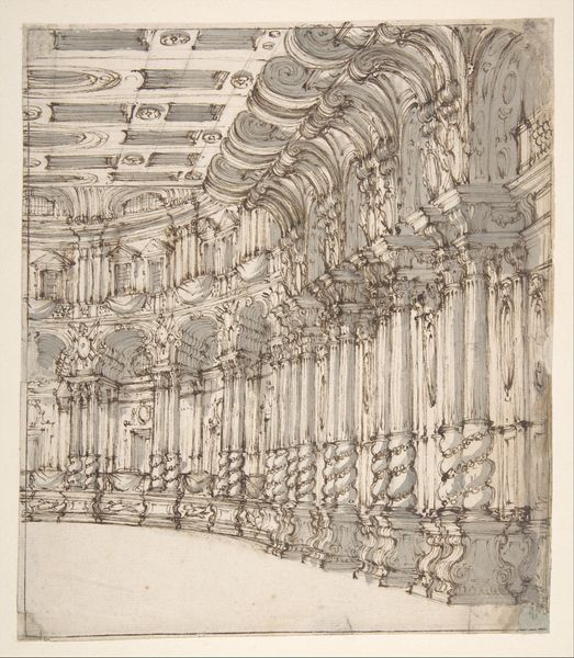 Curator: This piece gives me the shivers, honestly. It’s like falling into someone else's dream of stone. Editor: Fitting then, as it is architecture seen through the dream-like lens of Baroque illusionism. This ink and pen drawing, attributed to Ferdinando Galli Bibiena, sometime between 1657 and 1743, presents a "Foreshortened or Trompe L'Oeil View of the Architecture Surrounding a Courtyard." Curator: "Trompe L'Oeil," trick of the eye indeed. It's as if the courtyard is tilting toward us, defying gravity. Makes me wonder about the mind that conceived it. A mind that saw beyond right angles and plumb lines. Editor: Bibiena and his family were stage designers and architects, celebrated for their theatrical scenography, so perspective was their playground. It is not enough to simply *suggest* space, here. The entire material existence of this perspective hinges on convincing the eye it's more than just ink on paper. Curator: And succeeds marvelously. Look at the detail—the play of light and shadow, the sheer audacity of those receding columns. It feels both monumental and fleeting, doesn’t it? Like catching a glimpse of a city that only exists in the moment you see it. The use of pen and ink reminds us about the craft, though. Editor: Craft and mathematics working together. These effects required meticulous planning and understanding of perspective, using geometry as another material in constructing these spatial fantasies. It’s not just lines on paper; it's about control over materials to shape perception. Curator: It’s the sheer artistry behind the calculation that grabs me. The controlled chaos. Like Bach fugues made of buildings. Editor: Or perhaps architecture as the ultimate commodity, something to be consumed visually and conceptually, blurring the lines between tangible and illusionistic space through pen, ink and skilled labor. Curator: Perhaps. Whatever it is, it certainly got my heart rate up. And maybe, just maybe, helped me see the world a little bit sideways. Editor: Yes, by pulling back the curtain on materiality, on process, on the labour that informs how we understand what is 'real'.