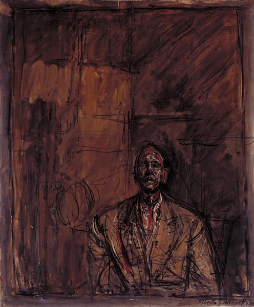 Alberto Giacometti made this portrait of a woman with what looks like ink and watercolor on paper. See how Giacometti builds form with a web of lines and washes? It's like he's trying to capture not just what she looks like, but also the very act of seeing her. The color is kept to a minimum - a few strokes of brown and grey, barely there. It’s more about the energy of the marks, the way they build up and dissolve, almost as if he is trying to trap the woman in the frame. Look closely at the hands, they're all knots and tangles, so expressive. They give you a sense of her presence, her nervous energy. Giacometti's work always reminds me of Francis Bacon, that same sense of existential angst. Both artists are constantly searching, never quite satisfied with what they see, and I love that kind of openness, that willingness to keep questioning.