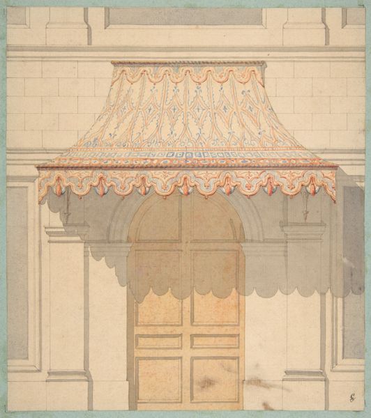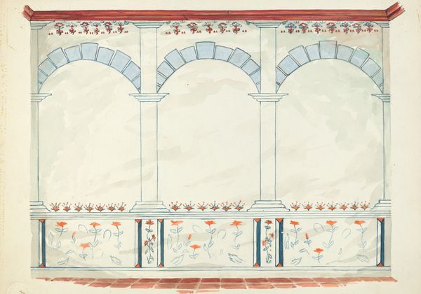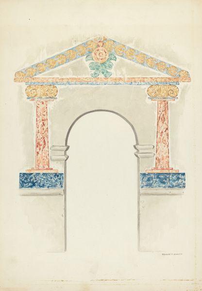 Editor: This is "Restoration Drawing" by Robert W.R. Taylor, created between 1935 and 1942. It's a watercolor and ink drawing, and the geometry gives it an oddly soothing yet artificial feel. How do you interpret this piece, looking at its structure and composition? Curator: Indeed. Let us first consider the surface; the pigments employed, specifically the muted palette of earth tones and blues, create a structured visual harmony. Observe the composition—the interplay between linear elements and repeated motifs generates a formal balance, would you not agree? Editor: I do. I notice how the architectural components, like the arches and the door, are rendered with meticulous lines, and how those contrast against the more organic, floral motifs painted on the facade. Curator: Precisely. These oppositions construct meaning. The contrast creates tension and a rather captivating dynamic. Note also, the flattening of perspective; it pushes the picture plane forward. Do you observe how this emphasizes the work's inherent two-dimensionality and flatness? Editor: I do, it makes the whole piece feel more like a study of shape and form rather than a realistic representation of space. What’s your take on how those choices affect the reading of the image as a whole? Curator: It steers the viewer to a consideration of pictorial structure over illusionistic depth. The artist directs us to contemplate formal relationships, color harmonies and balances. Through such methods Taylor delivers more than representation: he proposes a way of seeing. Editor: Fascinating. I hadn't thought about it quite that way before, focusing on his act of seeing, instead of just what's being seen. It's like the work is teaching you *how* to see the subject of restoration. Curator: A crucial distinction. Analyzing visual constructs like these provides a pathway into the aesthetic qualities embedded within, highlighting Taylor's artistic agency.