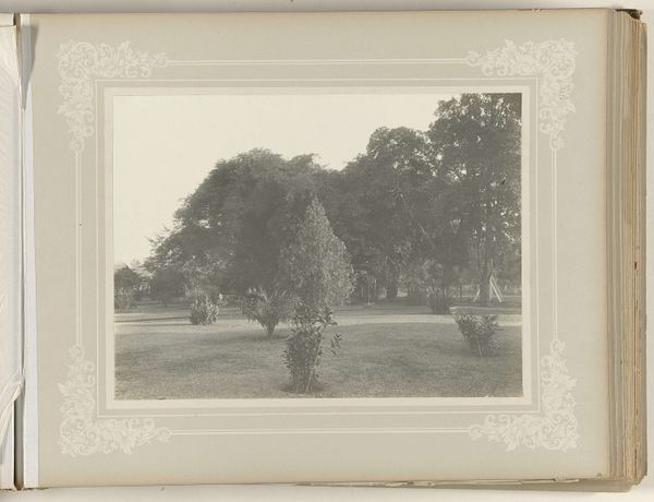Curator: Before us, we have a photograph entitled "Oprijlaan met palmen en tuin met dieren," or "Driveway with palms and garden with animals," believed to be from somewhere between 1890 and 1910, by Otto Hisgen. It's a gelatin-silver print capturing a very composed, serene landscape. Editor: That title just rolls off the tongue, doesn't it? My first thought? It’s quiet. Terribly quiet. And a bit...colonial, somehow? The symmetry is nice, a little too perfect, almost like a stage set. Curator: The "Orientalism" tag that is associated with the image might suggest some awareness of colonial contexts at the time. Palms, of course, are rich symbols, laden with victory, peace, eternal life—think of ancient Rome, early Christian art. The garden, even more so, as Eden itself. Hisgen layers this visual language quite deliberately. Editor: Hmm, victory and peace overlooking what, exactly? I wonder who this idealized garden was for, or maybe who it kept out. And, are those two canines by the small shrubs to the left? Perhaps the photographer's beloved pet? Curator: Indeed, two small dogs rest within the immediate foreground. Dogs feature prominently across cultures and time periods—fidelity, guardianship, status… Their inclusion suggests an attempt to domesticate the scene. Though what appears on first impression idyllic may betray the presence of labor and exclusion behind it. Editor: The framing really boxes everything in. It's this picturesque view but it feels totally manufactured and disconnected from everything. But the quality is fantastic—I imagine what stories the photographer might be able to tell. Curator: The albumen print heightens that sense of both immediacy and distance. The Orientalist artistic movement played into idealized, sometimes exoticized, perspectives and understandings of foreign cultures and the aesthetic composition of those societies. Editor: I'll admit, those palm trees *are* rather striking. But I see this image and wonder, more than anything, about what isn’t being shown, all the messiness politely cropped out. Curator: Photography from this period offers us a fascinating, complex, if limited, visual record—offering access, while masking or muting alternate voices, too. Editor: It is so easy to get lost in translation isn’t it? This artwork will definitely sit with me a while!