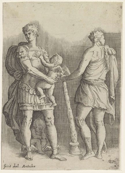 Jurriaan Andriessen created this drawing, "Laenas Draws a Circle in the Sand around Antiochus IV Epiphanes," using pen and brush with gray ink, likely in the late 18th or early 19th century. The application of ink washes, diluted to varying degrees, gives depth and volume to the figures. The immediacy of drawing allows for the capture of fleeting moments and gestures. Here, the lines are fluid, almost nervous, conveying the tension of the depicted encounter. The circle, lightly sketched, becomes a powerful boundary, charged with symbolic weight. The choice of ink on paper speaks to a tradition of quick studies and preparatory sketches, central to academic art practice. But beyond its function, the drawing offers insight into Andriessen’s hand and mind, revealing the material and intellectual processes behind the creation of an image. The artist engages with history, while leaving us with a tangible trace of his own labor. This challenges any divide between the so-called fine arts and the realm of craft.