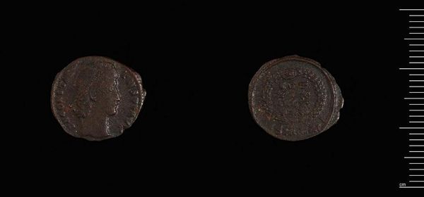 Curator: Let’s examine this artifact: a bronze follis of Constantine I, minted in Trier. It weighs just under 4 grams. Editor: It feels ancient and weighted with untold stories, doesn't it? Like holding a tiny, tarnished sun. Curator: Precisely. The coin features a portrait of Constantine, and on the reverse, we see the gateway to a military camp. Editor: That gate is so rigid, a symbol of Roman power, I imagine. Yet time has softened it, almost blurring the lines. Curator: Indeed. This coin served as propaganda, broadcasting the Emperor's image and authority throughout the Empire. Editor: And now, it whispers to us of the past. It makes you wonder about the hands it passed through, doesn't it? Curator: Exactly, from an emperor’s reach to ours, these objects are still in communion with the past, if we listen. Editor: It’s an amazing artifact that takes my breath away every time I look at it.