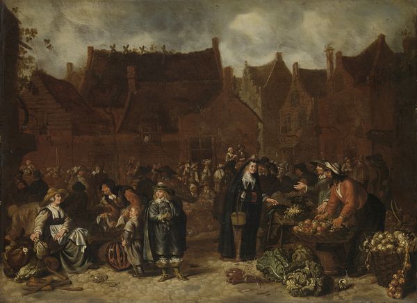 Editor: This is Hendrick Sorgh's "Fish Market," painted sometime between 1650 and 1670. It's an oil painting showing a bustling scene. What I find interesting is how the grey, almost monochromatic palette gives the painting this everyday, almost documentary feel, while the figures still manage to convey individual stories. How do you interpret this work? Curator: It’s fascinating how Sorgh uses seemingly mundane scenes to convey deeper cultural narratives. Think about fish itself. In Dutch Golden Age paintings, fish often symbolizes religious themes like resurrection and abundance. Does Sorgh's rendering offer more earthly, tangible associations? Or is there something more here? Editor: So you’re suggesting the fish market is more than just people buying fish? It could also have been understood as a kind of religious statement for viewers at the time? Curator: Precisely. Consider also the composition – the arrangement of figures, the architecture, even the boats in the background. Everything contributes to the sense of a thriving, industrious society, and potentially to a symbolic order. Even the clothing of the people depicted subtly alludes to varying positions within that society. The interplay of light and shadow adds emotional weight, no? Editor: It does. Knowing this symbolic perspective now I am appreciating details that before seemed almost banal to me. Curator: Seeing how daily life incorporates broader cultural narratives – a real journey, right? Editor: Absolutely. Thank you for showing me what to look for; it's given me a whole new understanding of the cultural significance.