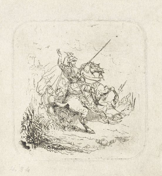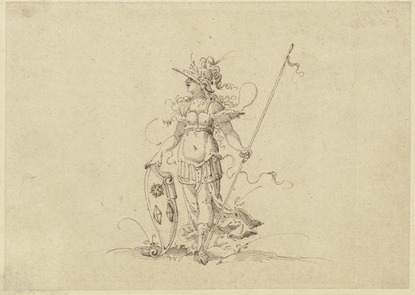 This drawing, A Soldier Brandishing a Shield in a Landscape, by the Monogrammist GK, presents a figure caught in dynamic tension, rendered with striking detail in pen and brown ink. The composition is immediately striking, focusing on a soldier mid-stride, his body a study in diagonals that convey movement and force. The landscape, though minimal, is integral; delicate lines suggest a wild, untamed space, enhancing the soldier's active engagement. The use of line is particularly noteworthy. Fine, closely-spaced lines create shading and volume, defining the musculature of the soldier and the contours of his armor. Thicker, bolder lines outline the figure, anchoring him in the composition. The overall effect is one of controlled energy, a balance between precision and dynamism. The drawing isn't merely a depiction of a soldier, it explores themes of action, conflict, and the human figure's relationship to its environment. The contrast between the detailed rendering of the soldier and the spare landscape invites us to consider ideas about heroism and humanity, reflecting a moment of individual will against the backdrop of nature.