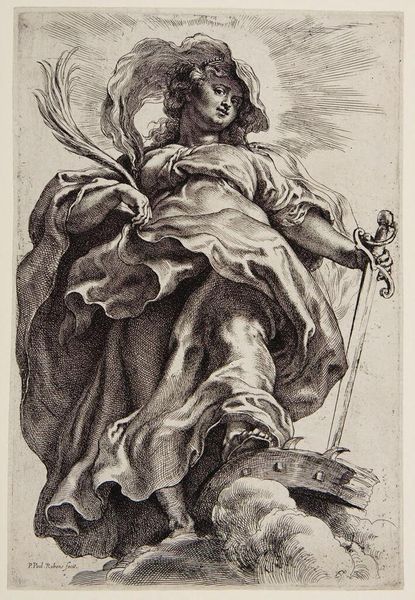 Editor: Here we have Peter Paul Rubens' engraving of Saint Catherine of Alexandria. There’s so much detail, and it appears she’s stepping on a broken wheel while holding a sword. What do you see in this piece? Curator: Looking at this through a materialist lens, the engraving technique itself is key. Consider the labour involved, the craft. Each line, etched into the plate, speaks to a specific process of production. Notice, too, how this method, though reproductive, makes Rubens' design accessible to a broader audience. Was this readily available to people of all social strata? What kind of consumption were they targeting? Editor: So, you’re saying the *how* it was made and who could get it is as important as *what* it depicts? Curator: Absolutely. The choice of engraving as a medium, versus painting, radically alters the reception and the socio-economic impact of the image. The Baroque was not confined to the halls of the wealthy. This wasn't some private indulgence, this image could be produced, disseminated. Editor: I never thought of that before! That changes everything. It's not just a saint; it’s about expanding his practice. Curator: Precisely. The commercial aspect shouldn't be ignored; it played an essential role in spreading Rubens' influence. I wonder who produced the final version we have in front of us. Editor: So, considering art through the lens of material and its impact is not separate from art history but essential to understanding it. That is interesting. Curator: Exactly, questioning how things are made opens the floodgates!