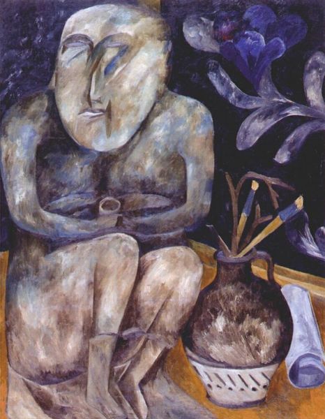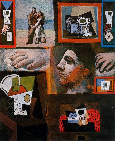 Curator: This striking oil painting is titled "The Three at the Table" by Pavel Filonov. Editor: It's quite unsettling, actually. The angular forms, the fragmented figures… it all feels rather claustrophobic, doesn’t it? Almost nightmarish. Curator: Indeed. Filonov, deeply rooted in the Russian Avant-Garde, was interested in disrupting traditional modes of representation. The Cubist influence is undeniable here—the breaking down of form into geometric shapes, the simultaneous perspectives... Editor: And that unsettling quality probably reflects the turbulent socio-political atmosphere of Russia at that time. Look at their faces; their features are distorted and somewhat vacant. Were they disoriented by the era or trying to process political tension around them? Curator: A possible and compelling perspective. He was known for his own kind of Cubism and Expressionism. The figures aren't presented as whole entities, but as assemblages of planes and facets, reflecting his idea of "analytical realism"—revealing the inner workings of the world. Editor: So, we’re not just seeing the surface, but all its inner tensions. I notice the elaborate still-life. What should have been an exuberant, joyous scene seems to hold a feeling of intense anxiety. The wine glass lifted high does not suggest celebratory. Curator: Exactly. Notice how Filonov employs the colour palette to achieve tension, using blues and reds to evoke psychological reaction. But this alludes to a complex understanding of class dynamics, considering how the artist, having been raised in poverty, was fascinated by depicting common laborers throughout his life. Editor: Right. As they sit "at the table", is that where the artist saw the people of the moment and the working class? Perhaps these are representative figures in that respect. I think this scene feels more like a last meal, right before a cataclysmic event than a simple gathering. Curator: Ultimately, it's about revealing a deeper, multi-faceted reality beyond surface appearances through both form and subject, challenging viewers to go beyond passive observation. Editor: A reality of fractured hopes, anxious souls, and uneasy gatherings, if I interpret this work correctly. It seems a powerful critique delivered in broken shards.