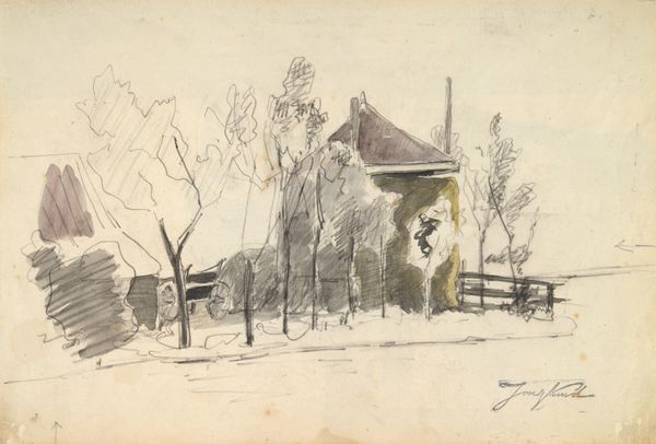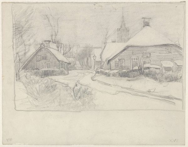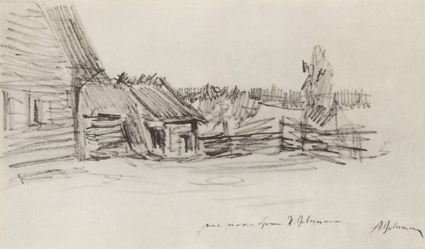Curator: This pencil drawing, "Little Village," was created by Isaac Levitan around 1895. I am struck by the bareness of the image, its austere composition, and the delicate hatching suggesting winter light. What do you see? Editor: I see a landscape distilled to its essence: simple buildings sketched with a seemingly hurried hand on a monochrome field. There's an immediacy in the line work, a feeling of being present in a harsh, rural setting. The visible pressure of the pencil hints at the social realities experienced by workers in late 19th century Russia. Curator: Interesting observation. The focus here is clearly on pure form: the horizontal lines of the buildings contrasting against the undulation of the ground; the interplay of light and shadow captured with minimal strokes. How Levitan uses such humble materials to construct such a clear scene of winter is noteworthy. Editor: True, and the choice of pencil on paper underscores a conscious return to fundamental practices. One can imagine how this deliberate constraint might mirror the scarcity felt amongst rural workers while they erected these dwellings. The artistic choices mimic their struggle to produce basic needs. Curator: While it is hard to divorce any artwork from the socio-economic forces that permeate society, the effect of the reduced palette adds a specific sense of serenity, and I would posit, even grandeur to an otherwise unassuming scene. The drawing transcends simple realism; it's an attempt to extract and distill something about the spirit of a place, but using merely tonal modulations. Editor: I would contend that spirit, or atmosphere, you refer to isn't independent from material concerns or social circumstance; quite the contrary. Those roughly-sketched cabins are rendered bare due to their simple construction techniques: they stand as testimonials to the working class who crafted them from crude lumber while experiencing some measure of scarcity. Levitan then used a simple drawing material to capture their story. Curator: I'll concede that the material simplicity adds depth, providing a lens onto what's being represented. However, the visual economy of the drawing creates something quite impactful to the viewer—beyond its literal subject, something more emotional. Editor: I agree, seeing how it captures a harsh beauty by laying bare the working lives it depicts. The simple choice of drawing then mirrors these values perfectly!