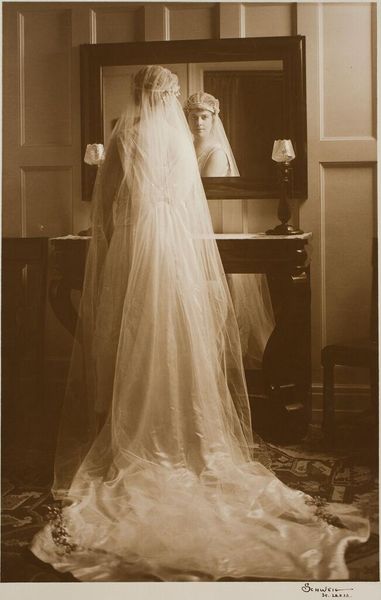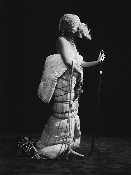 Editor: This is Valentine Hugo’s photograph, "Costume Représentant Parties Du Monde, Bal Louis XIV," from 1923. It’s quite striking! The figures with their elaborate crowns and the veiled fabric create a rather theatrical and unsettling image. What do you see in this piece? Curator: I see a symbolic representation of the self and its relationship to the world, refracted through the lens of history and theatricality. Consider those multiple crowned heads. Don't they evoke a sense of fractured identity, perhaps suggesting the multiple roles a woman of that era was expected to perform? Editor: That’s an interesting point about the fractured identity. The other heads seem mask-like. Curator: Exactly! They are masks, representations, perhaps alluding to the constructed nature of identity itself. The "Bal Louis XIV" reference pulls in layers of historical artifice and courtly performance. Hugo might be exploring how these past symbols continue to shape our understanding of gender and power. Notice the monochrome palette; does it distance the viewer, placing the scene in the realm of memory? Editor: Yes, it definitely gives it a timeless, almost dreamlike quality. I initially saw it as just a striking surrealist image, but the layers of symbolism are fascinating. Curator: And where do you think this photograph sits in Hugo's oeuvre and within the wider sphere of the Surrealists? Does the imagery connect with dream logic? What lasting images resonate across Hugo’s body of work? Editor: I’ll definitely have to delve deeper into Hugo's work. The image lingers in my mind, those faces seem full of secrets. Curator: Indeed. And that's the power of a symbol: its ability to whisper across time and cultures, prompting us to question our own place in the grand narrative.