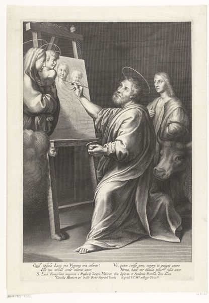 This print, titled "Lucas schildert Maria," was created by Jean Langlois, who lived between 1649 and 1719. Here, we see St. Luke, the patron saint of artists, immortalizing the Virgin Mary and baby Jesus on canvas. The image is fascinating in its depiction of the artist as a conduit between the divine and the earthly. Consider how this representation intersects with notions of gender and power. Mary, a figure of maternal purity and religious significance, is being rendered by Luke, a male artist. This dynamic speaks volumes about the gendered nature of artistic creation and religious authority of the time. Also notice how the gaze operates here; Mary looks out to the viewer, but Luke’s attention is focused entirely on his canvas, absorbed in the act of creation. This image invites us to reflect on the complex relationships between artist, muse, and the cultural values embedded in representation. It’s a reminder that art isn't just a reflection of the world; it's an active participant in shaping our understanding of it.