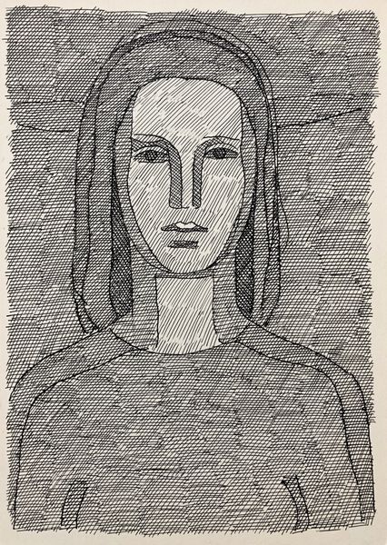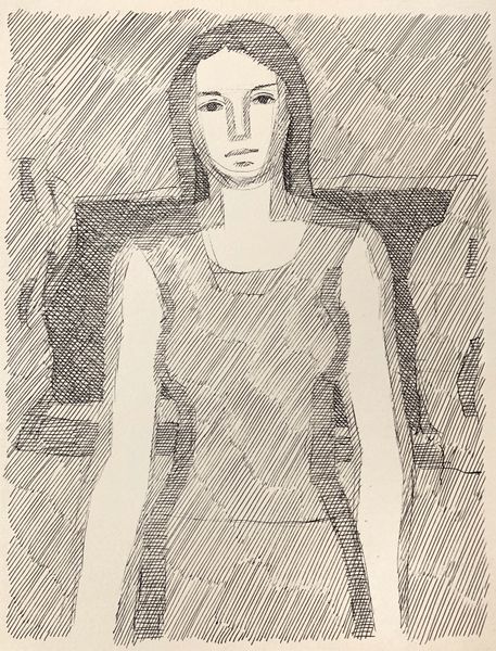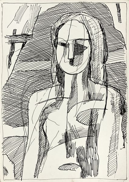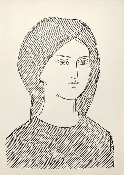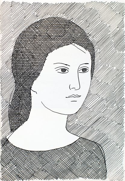 Curator: This is a pen and ink drawing titled "Female Image" by Hryhorii Havrylenko, created in 1975. Editor: There's something very striking about its simplicity. Just black lines on white, yet it conveys so much. It feels almost… melancholic, maybe due to the subject's downward gaze. Curator: Indeed. The line work itself is fascinating. The artist uses these repetitive lines, almost like hatching, to build up form and texture, and these are all key stylistic components in Havrylenko’s oeuvre. Do you find them to be evocative of anything symbolic? Editor: I see it in the treatment of the background and her hair. The density of the cross-hatching creates this textured ground against which her smooth face is presented, drawing the eye toward this focal point through simple contrast. Also note the pattern printed on the woman’s fabric which emphasizes this linear concept in practice. Curator: And if we explore how line work carries emotional and psychological weight over time, one might suggest the hatching pattern can be considered as bars. She is contained and in restraint. Consider the gaze we initially touched upon, what is she longing for? It invites contemplation of womanhood as constrained by external perceptions and boundaries. Editor: I agree about constraint. The lack of color and the starkness of the lines reinforces that. The simplicity can almost feel severe. This effect seems enhanced by the two conflicting angles utilized for her clothing as opposed to the backdrop, furthering this disjunction between the woman and the world she inhabits. Curator: I appreciate your highlighting the sense of disjunction in her stance in the world; that is an insightful read. But let’s be clear, Havrylenko does offer hope by subtly utilizing an accepted traditional visual vocabulary, while challenging his audience to re-interpret the semiotics. What do you conclude regarding the work? Editor: In terms of structure, I think the power of this piece rests in its ability to create depth and emotion using such limited means. It's an interesting exploration of how much can be communicated with just a few well-placed lines. Curator: It certainly presents the viewer with enduring mysteries embedded within seemingly simplistic form.