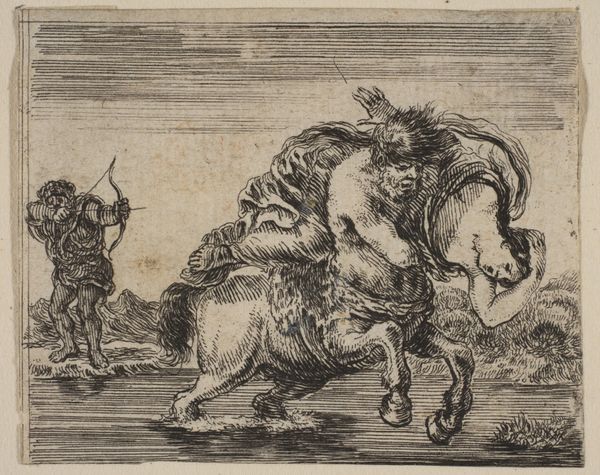 Curator: Standing before us, we have "Lion and Snake in Combat," an etching crafted in 1672 by Abraham Hondius. Editor: Whoa, primal fear in monochrome! That lion's snarl – it’s caught right between terrifying and fascinating, like watching a nature doc with the sound off. Curator: Hondius truly captures a raw dynamism, wouldn’t you agree? It’s a masterclass in Baroque energy confined to the precise lines of printmaking. Look at how the lion dominates the foreground, his tense muscles practically bulging out of the picture. Editor: And the landscape fading into the background – almost dreamlike in contrast to the intense, visceral struggle front and center. It creates this crazy feeling of claustrophobia, even though it's an open landscape. Does that landscape remind you a bit of someone else’s style? Curator: Yes, that landscape has similarities to other landscapes made by artists of the period. Hondius really focused his effort into detailing his figures to show the Baroque ideals of detail. Editor: It looks almost too intense! You wonder if it's a little on the nose, though. It's like, violence, struggle, boom! You get the feeling of "Oh no" for all parties involved! Curator: Yes, it seems very theatrical as part of a play. Maybe it tells something about power. What's fascinating to me is the dance, this twisted choreography of predator and… well, predator. Editor: And etched in the old way! It does lend this scene a certain weight that digital or screen prints could just never do. Knowing the labor and artistry involved adds an emotional layer of respect that just makes you want to ponder the past! Curator: Indeed, it encapsulates a period obsessed with drama, with powerful emotion. Hondius leaves us here, face to face with nature’s unforgiving beauty and that very brief reminder that something's got to give.