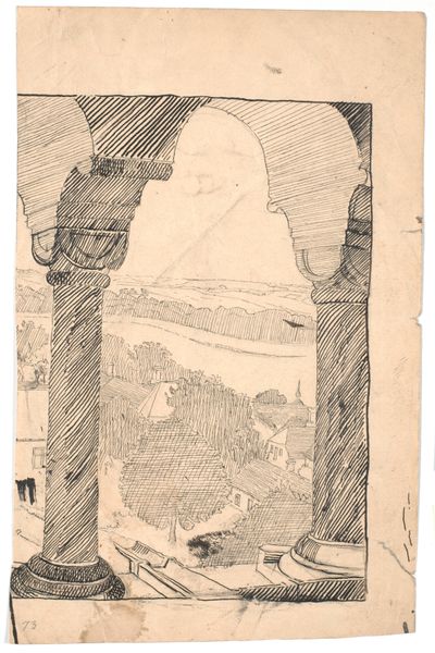 Editor: Here we have Wijnand Otto Jan Nieuwenkamp's ink drawing, "Weg richting een tempelpoort in Madurai," likely from 1916. It’s rather striking in its simplicity. There’s a solitary figure walking towards what looks like a temple gate, framed by these organic, almost dreamlike, rock formations. What do you see in this piece, and what’s your take on its impact? Curator: You know, it whispers to me of journeys – both physical and internal. The lone figure heading toward that gate…it feels allegorical, doesn’t it? Nieuwenkamp had quite a life as an artist-traveler and seemed to be in search of his own, if you will, artistic “gate.” Editor: A gate to artistic expression? Curator: Exactly! His journey to India, this drawing feels like more than just observation. Look at the thick lines, almost bordering on woodcut style, but softer. He’s simplifying, distilling, trying to capture the essence, rather than every detail. Almost like reducing a spiritual journey to its bare essentials – a road, a seeker, and a destination that represents something far greater than a mere building. Don’t you find the minimalism intriguing? Editor: Absolutely. The negative space gives it such an open, contemplative feeling, doesn't it? Almost as if the path stretches on, endlessly, toward something unknowable. It makes you wonder what the traveler hopes to find. Curator: Indeed. Perhaps the drawing’s power lies in the questions it provokes. Nieuwenkamp leaves plenty of room for us, the viewers, to insert our own journeys, our own destinations into his scene. I think the success resides exactly in that feeling of intimate sharing with a work of art that represents so much more. Editor: I never would have thought about it that way, really insightful! It’s made me think about my own path. Thanks for opening my eyes!