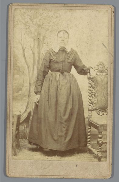 Editor: Here we have a photograph titled "Portret van een onbekende vrouw in Urker dracht," created sometime between 1885 and 1910 by J. Meyer. It’s struck me how it seems to capture a very specific time and place in history through this woman’s traditional clothing. How do you interpret this work, especially considering its historical context? Curator: The photograph indeed speaks volumes about its time. The “Urker dracht,” or Urk costume, places the woman within a very specific community, the village of Urk, which was quite isolated until relatively recently. Photography at this time became a tool to document these communities. This raises the question of agency. Do you think she chose to be photographed, presenting herself, or was she part of a larger project documenting regional types? Editor: That’s a really interesting question I hadn't considered. The woman’s posture seems quite formal, almost staged. It does make me wonder who controlled the image here and why. Curator: Precisely! Early photography had strong ties to scientific and ethnographic documentation. Photographs like this were circulated as postcards or collected in albums, often reinforcing certain stereotypes or exoticizing rural communities for urban audiences. Notice how her clothing, especially the elaborate head covering and embroidered details, becomes the central focus. What impact do you think such objectification had on the subject? Editor: It probably further marginalized them. Rather than seeing her as an individual, viewers were seeing a representation of an "other," potentially solidifying social distances. The backdrop looks almost artificial as well. Curator: Exactly. These elements remind us to be critical viewers. What seems like a straightforward portrait is actually deeply embedded within social and cultural power dynamics. Thinking about it, how does the museum affect our own contemporary relationship with photographs like these? Editor: It definitely adds another layer of interpretation, assigning an artistic and historical value that maybe wasn't initially intended. I now view it with much more critical awareness. Curator: Indeed. Looking closer always reveals the hidden layers beneath the surface.