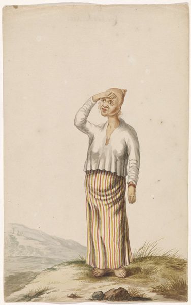 Editor: So, this is "Een Pers," a watercolor and pencil sketch, likely made between 1675 and 1725, by an anonymous artist. I’m struck by the figure’s elaborate turban and striped robe. How would you interpret this work? Curator: For me, the key here is to consider the social context of the production and consumption of images like these. Who made it, for whom, and under what circumstances? These types of drawings were often commissioned during periods of colonial expansion. What might the materiality—the paper, pigments, and the very act of drawing—tell us about that exchange? Editor: That's interesting. I hadn't thought about the materials themselves carrying that kind of weight. Could you elaborate on that a bit more? Curator: Think about it: where did the paper come from? The pigments? Was this artist commissioned, perhaps by someone involved in trade or colonial administration, to create an image of an exoticized "other?" The drawing isn't just a depiction, it's a product of a specific set of power dynamics and labor practices. Editor: So, you’re saying the image isn't just *of* a person, but it embodies the economic and social relationships of that time? The means of its production reflect a history of trade, labor, and possibly even exploitation? Curator: Exactly! Even the "anonymous" attribution speaks volumes. It removes individual authorship, which may downplay the role of the maker and further objectify the subject. By considering all of this, we can see how this image participated in, and perhaps reinforced, specific views on race and power. Editor: That really reframes my understanding. I was initially drawn to the aesthetics, but I now see it as an artifact loaded with complex historical implications. It is an intersection of material, labor, and power. Curator: Precisely. Examining the materials and methods allows us to excavate those deeper layers of meaning. I have learned so much, too.