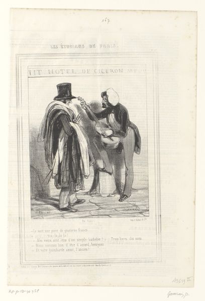 Curator: This 1874 print by Johan Michaël Schmidt Crans, titled “Spotprent op de ministeriële krisis,” is a commentary on a political crisis rendered in ink on paper. It employs caricature, a common visual strategy for political discourse at the time. Editor: My immediate reaction is intrigue, but also a sense of disorientation. The scale is quite jarring. A woman and lion are rendered nearly gigantic next to the gesticulating gentleman. The line work has this nervous energy too. What might the figures represent symbolically, in this context of a 'ministerial crisis?' Curator: Well, let’s break it down. Caricatures like this one use established visual tropes. The woman with the lion almost certainly embodies the Netherlands—a Dutch Maiden figure—attempting to navigate the turbulent political landscape, indicated by the word “krisis.” She carries a lantern, suggesting a search for clarity. Editor: Ah, so the lion at her side could signify strength and resilience—key attributes needed during political instability. And the little man seemingly lecturing the Maiden – who is that? His size is definitely commenting on his perceived authority. He is speaking out of turn. Curator: Yes! The diminutive figure is most likely a politician or perhaps even a political party leader. Caricatures love to play with scale and size to emphasize a figure’s importance or, in this case, lack thereof! The print uses figuration quite directly for political critique. The crisis itself can be understood as a narrative painting of the instability within government at the time. It really captures that moment. Editor: This type of image shows how potent symbols can be for reflecting public sentiment, the woman embodies an idealistic image of Dutch fortitude threatened by these blustering political squabbles represented by this small man who postures so grandly. It speaks to the continuous negotiations between power and image, even today. Curator: Absolutely. And this artwork reminds us how prints played a crucial role in shaping and reflecting public discourse in the 19th century. By employing simple visual metaphors like scale, symbols, and narrative imagery the artist made political analysis accessible and compelling to the broader population. Editor: Reflecting on it, I'm struck by how these symbolic shorthands offer a vivid, accessible snapshot of political anxieties of the time and how we still grapple with that in a visual culture overloaded by instant communication and social media.