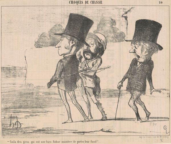Here we see Honoré Daumier's lithograph, its linear strokes and stark contrasts immediately draw the eye into a scene of satire and social commentary. The composition is dominated by a bust atop a pedestal, dedicated "To Flourens, by a grateful youth". Daumier’s use of line becomes critical here, because it is expressive and gestural. It conveys the exaggerated postures of the figures flanking the monument: one man is doffing his hat, the other is awkwardly gesticulating, amidst scattered debris at the base of the monument. Through these lines, the artist destabilizes the conventional meaning of public appreciation, suggesting a critique of the relationship between political figures and their supporters. The deliberate disarray and grotesque figures undermine any sense of solemnity, transforming the monument into a stage for mockery. Daumier uses the structure of public art to question the values it represents, suggesting that even in moments of supposed tribute, the undercurrents of social and political life reveal deeper complexities.
