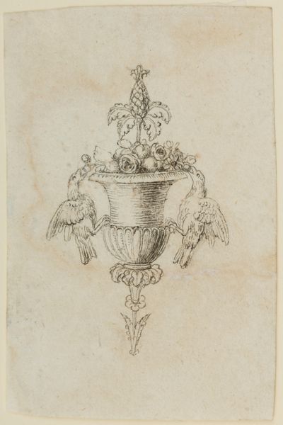 Editor: This is Jean Bernard Toro’s “Nouveau Livre de Vases,” a drawing and etching from 1716. It's incredibly ornate; the etching technique makes the vase look so delicate. How would you interpret this work, seeing it here in the Met? Curator: The image presents a baroque sensibility celebrating excess, privilege and power, right before the dawn of the Enlightenment and revolutions that would upturn those values. What do you make of that tension? Editor: It's strange, I see these cherubs playing so freely, adorning something that I'm guessing was designed for a wealthy household… How do those elements tie together? Curator: Exactly! Those details provide insight into the performative aspects of wealth and the innocence of childhood in contrast to the realities of labor and class disparity at the time. Consider, also, the decorative arts as a gendered field-- what statements do the design and gender associations of the work convey about its place in that period? Editor: I hadn't thought about gender playing a role, but I see your point, with the cherubic figures and ornate detail! I'm also struck by how an object meant for display also has this embedded critique within it. Curator: This tension between beauty, social context and purpose offers fertile ground for exploring not just the artwork itself, but also the society that produced and consumed it. So much is happening just below the surface. Editor: I agree, this tension between overt beauty and potential critique completely changes how I see it now. Thanks so much! Curator: Indeed. Considering the original socio-political context provides another richer layer to appreciating it.
