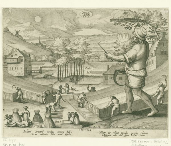Jan Collaert II created this engraving, "Juni," sometime before his death in 1628. It's a depiction of the month of June, viewed through the lens of labor and the agricultural calendar. This image creates meaning by drawing on visual codes tied to seasonal work and zodiacal signs. Made in the Netherlands, its landscape reflects the concerns of a culture deeply invested in land use and productivity. Collaert’s print isn't merely a picturesque scene, but a window into the social structures of his time. The act of sheep shearing, the harvesting of crops, and the laundering of wool, all tell of an economy and a society built on the cycles of nature. Note the prominent depiction of Cancer, the zodiac sign for June, reminding us of the influence of astrology on daily life. Understanding this print requires a deep dive into 17th-century Netherlandish life, using sources like agricultural manuals, weather records, and even estate inventories. Art history, in this case, becomes a dialogue between image and context, revealing the intricate relationships between people, their environment, and their beliefs.