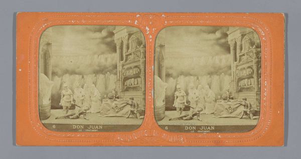 Curator: This striking stereoscopic photograph is titled "Binnenkomst van Orpheus in de hel," or "Entrance of Orpheus to Hell" and was created sometime between 1868 and 1873. Editor: It's… unsettling. There's this immediate sense of theatricality, a staged drama that both attracts and repels. The lighting is harsh, highlighting the figures in a very dramatic way, contributing to this eerie vibe. Curator: Indeed, the "Diableries" series, of which this image is part, reflects a popular fascination with the occult and moral anxieties prevalent in the late 19th century. The artist utilizes the relatively new medium of photography and this stereoscopic format for, well, the creation of politically charged satirical tableau vivant scenes. This work currently resides in the Rijksmuseum collection. Editor: I notice how the female dancers, their youth, their costumes, become implicated in a darker, more exploitative narrative when placed against the image's background and mythological characters. It hints at themes of innocence corrupted, perhaps reflecting social anxieties surrounding morality and representation in that era. What political issues do you detect at work here? Curator: "Diableries" photographs often targeted figures of authority like politicians, members of the clergy, and of course, members of the aristocracy and imperialist elite. Given the orientalist style infused here, these scenes frequently caricatured them by aligning them with figures representing vice and wickedness, questioning their morality. We see this as social commentary embedded within this medium and its distribution. Editor: Given its inherent critique and commentary, what are your views on how it operated in public life and the world of images? Curator: Because of how widely images were consumed back then and the level of spectacle produced, I believe it played a key role in democratizing narratives while being shaped by larger social narratives of power and access to technologies of production. As it still does today, that public role of art and the politics of imagery would definitely play an important role. Editor: Absolutely, considering this piece makes us ponder what performative justice or resistance even look like through art made for, and within, structures that profit from them. Curator: Agreed, a lot to reflect on from what seems like an otherworldly piece of history. Editor: I leave seeing power differently, yes.