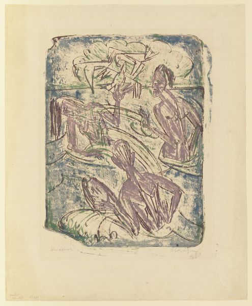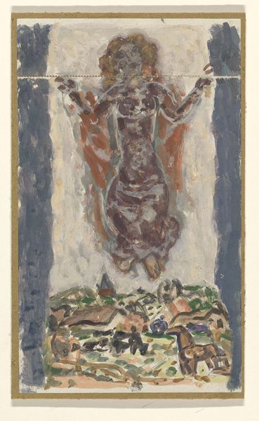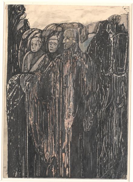 Curator: Here we have "Decoratief ontwerp met bovenaan twee herauten," a decorative design featuring two heralds at the top by Carel Adolph Lion Cachet. It dates roughly from 1874 to 1945, and employs ink, watercolor and drawing on paper. Editor: My initial impression is one of obscured figures and vibrant materiality—the red and black wash drawing feels somehow urgent, even with the stylized heralds and key design. Curator: Yes, let's consider that. These heralds, traditionally messengers of significant news, are rendered here as figures within what reads as almost oppressive frames. Is there perhaps a subversive commentary here? The visual tension resonates with feminist theory challenging the power structures embodied by heraldic figures. Editor: I agree. Cachet’s use of watercolor, ink, and paper speaks volumes about accessibility and process. Compared to traditional heraldic display employing precious metals or oil paints, the materiality here suggests an intention to democratize, to make the symbols and messages accessible to a wider audience. What does this mean? Curator: The inclusion of various grouped figures creates a sense of community viewing these heralded messages. What socio-political shifts might Cachet be responding to in that era of significant industrial and colonial expansion? Editor: I’d also ask us to consider Cachet's use of bold strokes and layering, particularly evident in the lower figures. This approach isn't just aesthetic; it reflects a physical engagement with the material that implies labor. Was Cachet influenced by the Arts and Crafts movement, where process and hand-making were valorized as acts of resistance against mass production? Curator: That adds depth. These abstracted figures suggest an attempt to grapple with notions of collective identity and voice, but are we to read the obfuscation as commentary on power? Are these messages for all? Or are they deliberately excluding certain groups? The use of heralds typically communicates hierarchy. Editor: So interesting to view through those lenses of production and consumption, and question whether Cachet is deliberately muddying the lines between mass-produced symbolism and individualized craft. It really reframes how we might approach heraldry and message as not solely authoritarian, but perhaps as objects and ideas ripe for reinterpretation. Curator: Exactly! Exploring his creative decisions and this art’s place in cultural movements helps contextualize the visual vocabulary here—a truly stimulating exercise of connecting historical context with art making, opening up our perceptions around identity in design. Editor: And questioning, also, where labor, materials and making fit within broader social messages in the era, allowing us a clearer view into the artwork's original cultural dynamics!
