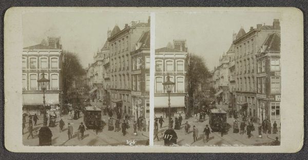 Curator: Here we have an early photograph capturing the hustle and bustle of Vienna's Neuer Markt, dating back to around 1908 or 1909. Editor: It certainly conveys a sense of frenetic energy. The grayscale and perspective make the whole street scene look rather dense and claustrophobic. Curator: Observe the photograph's structure: the artist's focus is rigidly fixed in capturing the perspective; lines receding towards the background form an inverted ‘V’. The rigid arrangement evokes a sense of stability in this otherwise restless environment. Editor: Interesting point! What strikes me most are the horse-drawn carriages and early automobiles; can you imagine the labor involved in maintaining all of that infrastructure, the literal tonnes of hay and feed that would have needed moving into the city on a daily basis? Or think of all of the stable hands, drivers, and other trades who depended upon this activity! Curator: Such elements lend an unmistakable rhythm to the composition—the repetitive shapes of the carriages mirror one another. Note how the rooftops ascend to the firmament, symbolizing mankind's architectural aspirations. Editor: Sure, one can say that the architecture of those days served symbolic purposes; still, what remains quite evident is the cost, labour, and materials necessary for sustaining these city infrastructures. Photography being one of the documentary mediums available for people of the future to look back and observe those past human activities. Curator: The charm is palpable. These kinds of compositions take viewers on a journey that blurs the frontier between simple reality and pictorial poetry. Editor: Absolutely; and reflecting upon all this has prompted an even more keen sense for what it meant to live and work in the days when Vienna was flourishing with these modes of transports. I am also very impressed to imagine all the working hours of post-production in creating photographs. Curator: It really inspires fresh thinking, I suppose.