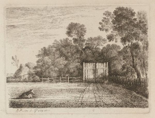 Editor: So, here we have Jacobus Ludovicus Cornet's "Open Hoevepoort," likely created sometime between 1825 and 1882, using pen, ink, and etching. The details are incredible. I find this work both rustic and slightly melancholy. How do you interpret this work? Curator: That's an astute observation. Looking at it through a socio-historical lens, consider the context of 19th-century rural Netherlands. The gate isn't just an entryway, it is also a symbolic point of access and control. Who gets to pass through, and who is kept out? Consider how land ownership during this era contributed to power structures and shaped class divisions. How does the artist represent that social dynamic, if at all, in this scene? Editor: It almost looks idyllic, but you’re right. The gate does imply a barrier, even in its openness. There's something slightly guarded about it. The details also create a strong divide, contrasting the rough gate to the flat background with a single person far in the distance. Curator: Precisely. The “idyllic” is often a constructed narrative. Who benefits from perpetuating that narrative, and at whose expense? Who is present, and importantly, who is absent from this depiction of rural life? How does this representation reflect or challenge the prevailing social hierarchies of the time? The landscape genre itself has a loaded history. Editor: So, by focusing on what’s *not* there, we can reveal so much about what *is*. This artwork, ostensibly simple, is much more layered and nuanced than I initially thought. Thanks! Curator: Exactly. Seeing art as inherently political, deeply intertwined with its historical moment, transforms how we see not only this work, but all art.