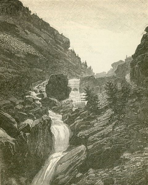 Editor: This is Giuseppe Barberis' "Cascata Delle Marmore," an etching and graphite print from 1895. It really gives me a feeling of dramatic scale and also intricate detail. What do you see in this piece that I might be missing? Curator: Oh, this makes me want to put on my walking boots! The way Barberis captures the cascade... it's almost symphonic, isn't it? Can't you just *hear* the water crashing down? What’s interesting is that he presents this immense power with such delicacy – look at those wispy lines he uses for the falls. It reminds me of romantic notions of nature: beautiful, terrifying, and sublime all at once. Does it evoke that in you? Editor: Absolutely. I guess I’m just fascinated by how he creates such a sense of depth using just black and white. It’s almost photographic. Curator: Exactly! There’s something quite modern about that. Yet, at the same time, this is 1895. The printing process allows him to recreate and sell his art…almost like an early photograph for mass distribution, allowing everyday people access to spectacular views like this one! Almost like a 19th-century postcard, but far more lovely, wouldn't you agree? Editor: Definitely more lovely. Thinking about it that way gives me a new perspective on landscape art in general, it almost becomes democratized by these art production advances. I’m gonna look at prints in a whole new way now. Curator: Me too! It is just so amazing when the personal touches and expressive qualities, captured in graphite and etching, let a new interpretation of this landscape gush out. It truly shows its worth, don’t you agree?