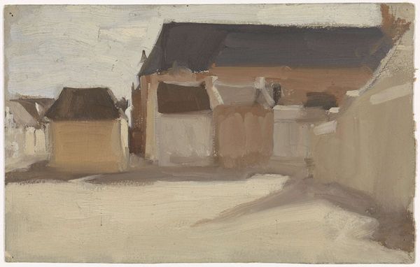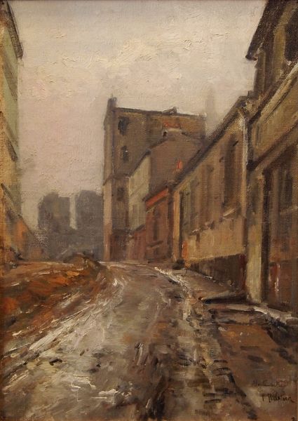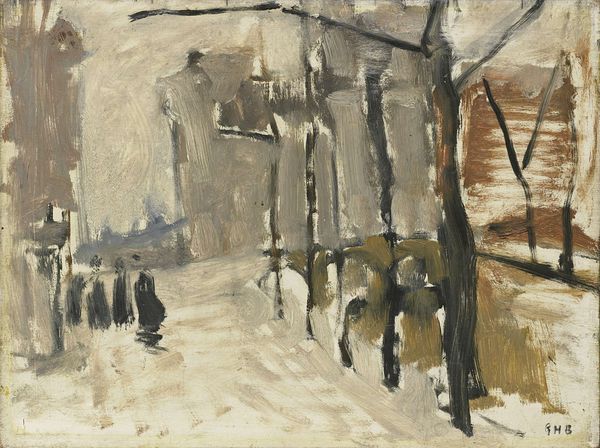 Editor: Here we have George Hendrik Breitner’s, "The Demolition of the Grand Bazar de la Bourse on the Nieuwendijk, Amsterdam", painted between 1893 and 1897. It's an oil painting and has such a melancholic, almost haunted, feeling. What catches your eye when you look at it? Curator: Well, aside from the fact that the title gives the whole game away – which, frankly, I appreciate – I find the impermanence stunning. It’s more than just bricks and mortar being torn down; it's like witnessing the fleeting nature of progress itself, wouldn’t you agree? I find it also raises questions: How does capturing such ephemeral moments play into our perception of history? Editor: That's a lovely point. The brushstrokes feel so loose, and it gives it such a feeling of decay. Curator: Precisely! Breitner doesn't glorify the demolition; he presents it raw. Note how the muted colours almost mourn what's being lost to modernisation. What do you think that tension does to the composition? Editor: It’s like the painting is fighting against itself; part of it is moving forward, and part of it is stuck in the past. It is visually very effective at communicating this sense of disruption and transition. Curator: Exactly! And thinking about it now makes me remember my own connection to witnessing something change—but that's another story entirely. Maybe all painting is just trying to immortalize moments slipping through our fingers? Editor: It certainly feels like Breitner's trying to hold onto something here. Thank you for providing such valuable insights. Curator: The pleasure was all mine. I might look at all demolition sites completely differently now!