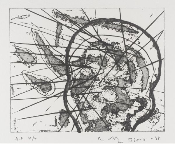 Curator: This is Per Inge Bjørlo's "Head VIII," currently residing in the Tate Collections. Editor: It looks like a skull exploding from the inside out. It's haunting. Curator: Bjørlo's work often reflects the anxieties of modern society, exploring themes of alienation and psychological fragmentation. How does this relate to the piece? Editor: The distorted, almost violent, rendering of the head speaks to a deep sense of inner turmoil. Perhaps a commentary on mental health or the pressures of identity? Curator: Indeed, Bjørlo engages with existential themes, which aligns with postwar concerns regarding the psychological impact of societal structures. Editor: The stark contrast between the dark ink and the blank space is striking. It emphasizes the feeling of dread. Curator: Bjørlo's printmaking technique adds to the emotional intensity. The medium becomes a powerful tool for social commentary. Editor: Seeing this, I'm left pondering the weight of human existence, questioning how we carry our burdens and traumas. Curator: Absolutely, art like this compels us to confront the darker aspects of the human experience, fostering greater empathy and understanding.