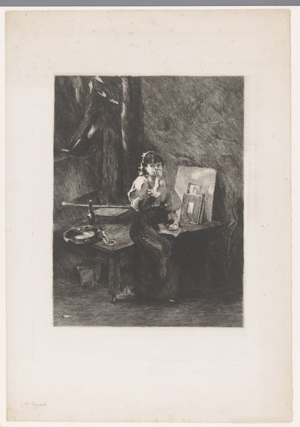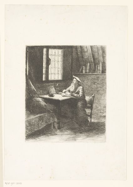 Editor: This is "Vrouw met twee slapende kinderen wachtend bij een open raam," from 1856, by Willem Linnig. It's done with ink and pencil, depicting a woman with her children indoors. The mood feels heavy, expectant, maybe even a bit somber. What catches your eye when you look at this drawing? Curator: What I immediately notice is the visible labor embedded in the image itself. Consider the rough-hewn wood of the beams, the handmade quality of the window panes. These aren’t mass-produced materials. They speak to the artist's deliberate focus on the raw materials that shape everyday life, don’t they? And by extension, to the societal systems around material production and labor that contextualize it. How does Linnig highlight the circumstances of labor and production in this scene? Editor: That's interesting, I hadn't considered the window itself! It draws my attention to how the process of making something functional can still be beautiful, like the intricate patterns of the window. Curator: Exactly! And what about the labor of motherhood implied? A woman pauses, maybe from housework, and the weight of domestic life, with those children so physically attached. Consider the material realities for women then – expectations, constraints. Think about the production of drawings like this too: Who was the intended audience, and what commentary does it make regarding their societal status? Editor: It almost feels like Linnig is trying to show the true picture, focusing less on the grandeur and more on everyday material life and the physical and emotional toll it has on individuals. It does invite some thought about the accessibility to art itself during this time period, and it’s possible audience. Thanks for broadening my view. Curator: And thanks to you as well, it’s good to refocus on art as it embodies lived experiences and also to think through the lenses of materials and production processes!
