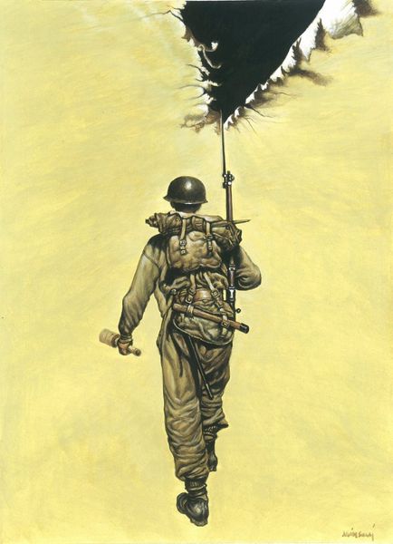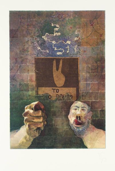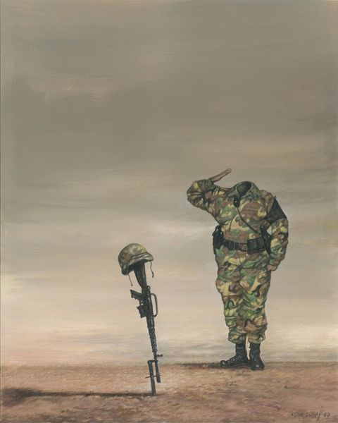 Curator: Benny Andrews created "War Clouds" in 1990. It's a painting that powerfully juxtaposes the figure of a soldier against an ominous, layered sky. What are your initial thoughts? Editor: My first impression is unease. There’s something deeply unsettling about the composition. The almost sculptural presence of that lone figure feels incredibly isolated against this turbulent sky. It's quite striking. Curator: I agree. It's essential to note Andrews’ process. He frequently combined collage with paint. If you look closely, you'll notice the textural layering; he builds up the surface of the clouds, almost as if constructing them from fragments. This method lends itself well to the neo-expressionist style of this work. Editor: And those fragmentations really underscore the psychological and emotional impact of conflict. The fragmented clouds feel like a direct metaphor for fractured lives and realities under the weight of war, connecting to Andrews's own history of growing up in the segregated South. This piece surely reflects on broader themes of oppression and resistance. Curator: Absolutely. Consider, too, the material choices: Andrews primarily employs acrylic and oil paints, techniques that speak to a modern approach while evoking traditional modes of artistic representation. The physical properties of paint allow him to manipulate the surface and enhance the raw, emotional feel. Editor: The figure itself embodies so many anxieties of masculinity intertwined with military service. He is on the front line of war while remaining stuck to the social scripts that normalize such aggression and violence. This becomes visible via the narrative that's built, connecting the act of creating with cultural memory and political resistance. Curator: The very making of the image seems linked to the themes. There’s a roughness to the construction—the collaged elements, the visible brushstrokes. These create a kind of tangible tension mirroring the unease it explores. The deliberate, almost handcrafted quality is so evident and deeply thought-provoking. Editor: The piece allows space to explore the layers of war, gender, race, and class intersecting together. Understanding that interplay is critical for unraveling a more complete historical narrative. It leaves you questioning not just what war does but to whom, and who benefits from it. Curator: I find it compelling how the artwork transforms familiar materials and painting practices into a vehicle for poignant social commentary. Its legacy prompts examination of making art as a process loaded with intention. Editor: I'll certainly reflect further on this artwork through its powerful intersectional commentary and lasting societal critique. Thank you for unpacking its nuances with me.