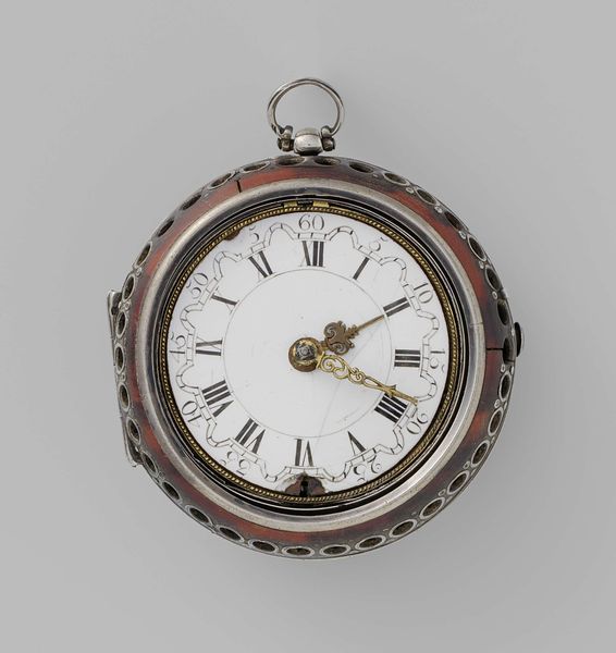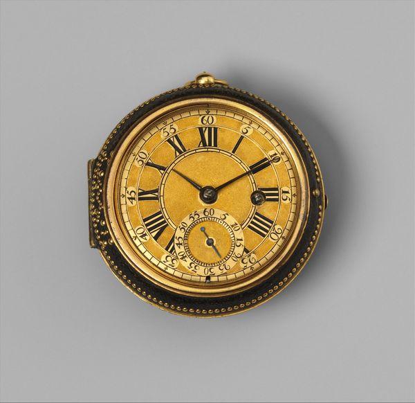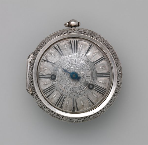 Curator: Here we have a fascinating object, simply entitled "Watch", dating back to 1645-1655. It's part of the decorative arts collection. What strikes you first about this piece? Editor: Honestly? The miniature landscape engraved right onto the watch face! It's almost dreamlike, a little whimsical castle presiding over, what, is that a rushing river? It feels like time is flowing right through it. Curator: Precisely. Note the composition: the landscape isn’t merely decorative, it integrates with the time-telling function. Consider the semiotics at play—the miniature reflects the baroque interest in microcosm, the idea of encapsulating a world within a smaller form, emphasizing both artistry and symbolic depth. The materiality—metal—also invites reflections on time’s passage versus the enduring nature of the medium. Editor: So, not just a pretty face, eh? I like that it merges something practical with, well, a tiny fantasy world. I can just imagine the artisan, carefully etching away, lost in the details, in the creation of, not just telling time, but crafting a little portable escape. Curator: Your "escape" is an insightful observation, indeed, because time transcends a mundane measure—it transforms it, instead, into a sophisticated signifier of status. What we see is a highly valued and embellished object intended to communicate affluence and artistic appreciation. Editor: Status anxiety, even back then. Still, there's something charming in its extravagance. And maybe something melancholy too. All that careful craftsmanship, all that beauty, destined to tick away, second by second… Curator: That sense of melancholy aligns well with period vanitas motifs. Even here, time as luxury remains inexorably tied to finitude. Editor: So, it’s not just about what time it *is,* but about time itself. Food for thought – a bite-sized philosophy lesson that fits in your pocket! Curator: Exactly! Such multilayered signification encased in a single object exemplifies why the "Watch" remains a significant study.