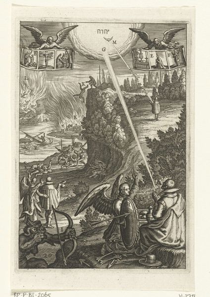 Editor: This intricate engraving, titled "Embleem met de mens die zijn kruis draagt en zich bewust is van tegenslagen op zijn weg," roughly translates to "Emblem with the man bearing his cross, aware of adversities on his path." Created between 1620 and 1623 by an anonymous artist, it’s currently housed in the Rijksmuseum. The mood is quite somber. All these figures hauling crosses… What do you make of this, seeing it now? Curator: Ah, yes, a visual symphony of struggle! Imagine yourself transported to the early 17th century. This print isn’t just a pretty picture; it's a moral compass, a guide through life's inevitable hardships. Each figure trudging along with their cross represents humanity burdened by its earthly woes. Editor: I see that, the figures are struggling a lot with what seem to be heavy crosses, there are others in hell! But why so many? Curator: Precisely! It’s the "everyman" struggling with adversity. The ladder is showing possible paths but it ends in a place that is pretty scary with evil birds flying around. That top part contrasts beautifully with the chaos below, doesn’t it? With that heavenly reward being granted to those who climb closer. A light, even if not obvious! The anonymous artist captured something pretty eternal. What does it tell you about our fears? Editor: That our struggles will amount to something better in the afterlife? It reminds me that our life is to try to be better. That feels so heavy to deal with. Curator: The Baroque artists are fantastic to elicit an emotional reaction. Editor: They sure do! Seeing this all laid out has really put things into perspective. There's a strange comfort in knowing everyone’s got their own cross to bear, metaphorically speaking of course. Curator: Indeed, a cross-generational tale etched in lines. Each time you view this, you'll see a different shade of truth reflected in its mirrored sorrows and triumphs.