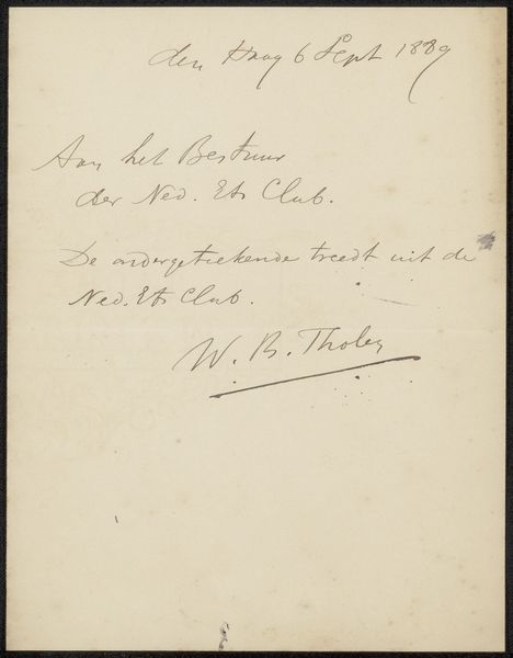 Curator: The Rijksmuseum holds a delicate letter in its collection, entitled "Brief aan Philip Zilcken," penned by Maurits van der Valk. It's an ink and pen drawing, with an air of casual formality. What strikes you first about this piece? Editor: It’s the handwriting. The calligraphic strokes remind me of another era—it's imbued with melancholy and perhaps… resignation? There's an elegance to it, even in what appears to be a simple note. Curator: Absolutely. Van der Valk was corresponding with the art critic Philip Zilcken, and this seems to be a letter offering condolences, judging from the phrase "van mijn hartelijke deelneming," which translates to “of my sincere sympathy”. You know, handwriting, in itself, is such an intimate and individualized form of expression, even if we aren’t quite sure when it was composed "after 4". Editor: You're right; the gesture of condolence carries a particular weight, and it says so much that we have the trace of Van der Valk’s emotions rendered through ink and paper, saved to last for us. The looping, flowing script feels so human, especially juxtaposed against our modern digital communication. But why preserve such a personal artifact in a museum? What can it tell us about Van der Valk as a public figure? Curator: It offers a window into the artistic networks and relationships of the time. Zilcken, as a prominent critic, wielded considerable influence, and this letter highlights the social dynamics within the art world of that era. Also, the act of writing itself was deeply ingrained in social interactions and I feel its presence, it symbolizes a slower, more thoughtful pace of communication now lost to history. It brings me to appreciate the deep continuity with our human nature: offering condolences for death of dear one, being always painful regardless the year. Editor: I think you have hit a point. I see a reflection of myself offering these same words of sympathy across time through this artifact, in all honesty. Well, thinking about it, it may seem simple from a distance, but seeing such immediate gestures preserved speaks to what endures.