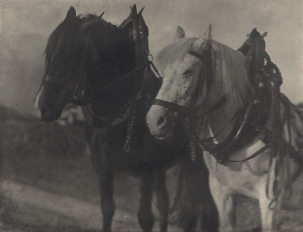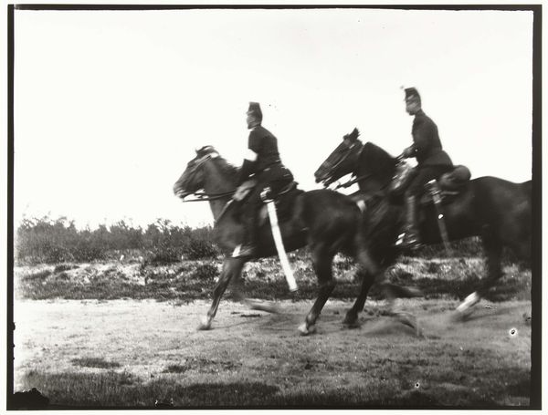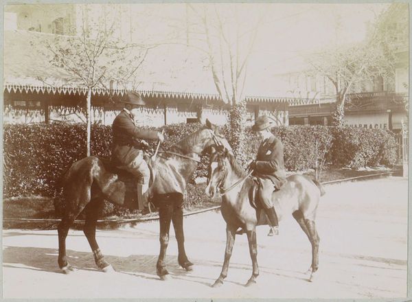 Curator: Right now we're looking at "Militairen te paard in een legerkamp te Fontainebleau," taken in 1896. It's attributed to Delizy, part of the photography collection here at the Rijksmuseum. What leaps out at you first? Editor: Immediately, it’s the light—that sepia wash that time gives everything, softening the edges and lending this feeling of…pastness, of something long gone but somehow still present. There's a sense of order and quiet observation. The contrast between the soft background and the sharpness of the riders strikes me the most. Curator: Absolutely. Think about what horses symbolized, then, particularly within military imagery. They weren't just transportation; they embodied power, status, virility even. These officers become centaur-like figures, blending human intellect with animal strength. Editor: And you see that echoed, of course, in classical statuary and paintings where military or political leaders are so often depicted on horseback to highlight authority. And it isn’t just their authority, but their mastery, their capability to govern not only the country, but their very own, and gigantic, war horse. It reflects the cultural memory of leadership and conquest, wouldn’t you agree? Curator: Without a doubt. It’s also intriguing to note how the artist captures a moment that isn't necessarily heroic. The composition isn't about charging into battle; instead, it’s this quieter scene of military life. Even genre-painting. You're given these intimate vignettes of what those times look like, not for the faint of heart. What secrets are those trees holding I wonder. Editor: Perhaps it's meant to convey preparedness—the quiet before the storm. Or, that even amidst war, everyday routines persist. Those tents pitched behind them suggest this sort of duality: domesticity against this background of potential disruption and upheaval. It adds layers of psychological complexity. Curator: Yes, and there’s also something very impressionistic about it. The way the artist seems less interested in photorealism and more focused on evoking atmosphere, light, a mood... I love how photography allowed artists to play with the seen and unseen in those days. Editor: In a way, that impressionistic quality lets our imagination fill the gaps, and perhaps make the scene resonate deeper within each viewer's emotional experience.