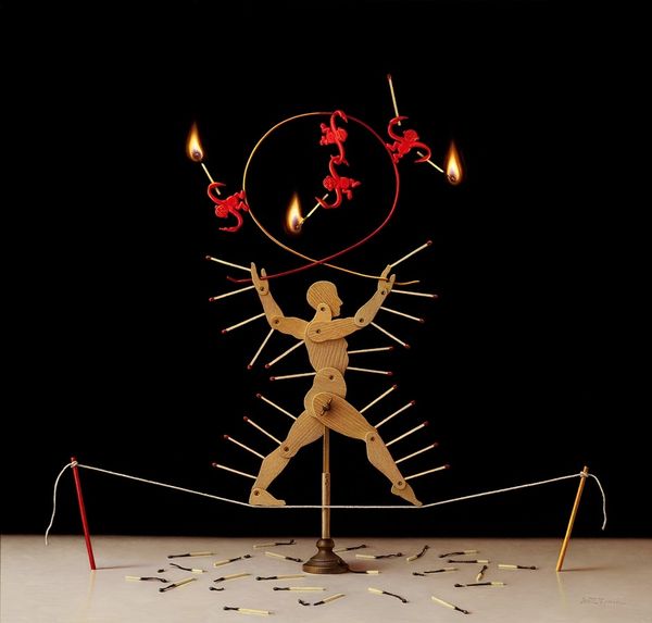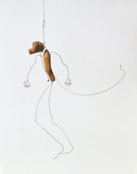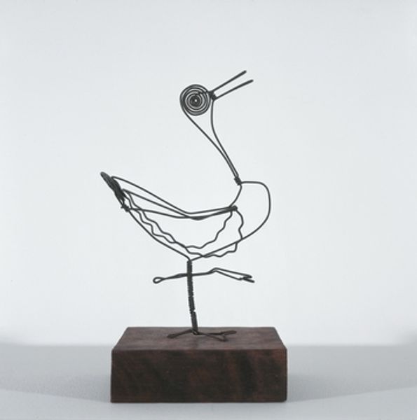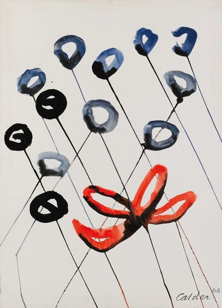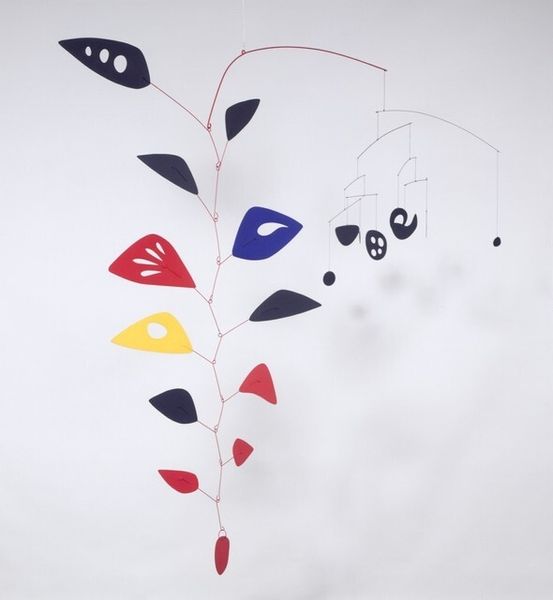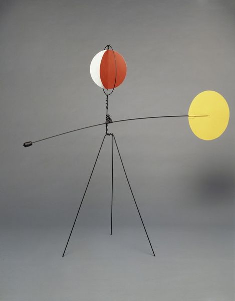 Editor: Here we have Alexander Calder's "Un Effet du Japonais," created in 1941. It's a striking sculpture crafted from metal. I find the composition so dynamic; it almost looks like it's dancing. What do you see in this piece? Curator: Focusing on its intrinsic properties, the relationship between line, plane and mass is critical. The stark contrast of red and black emphasizes a visual push and pull. Observe how Calder uses line not to depict, but to *create* space. Do you perceive any hierarchical relationship within the structural composition? Editor: I notice how the red sphere seems to balance the radiating lines on the left, and how this mirrors the balance between the solid black disc and the other set of lines on the right. It feels like a deliberate equilibrium is being created. Is that related to the title, suggesting an effect or influence from Japanese art? Curator: Possibly. Considering Eastern art, with its emphasis on harmony and asymmetry, it’s likely Calder was consciously exploring these concepts through purely formal means. Notice the delicate balance between stability and implied movement inherent in the structure itself. He exploits visual contrast through formal means. Editor: That’s fascinating. So rather than trying to represent something specific, he's focused on the visual interplay of shapes and lines. I initially looked for a deeper meaning, but I can appreciate the formal construction now. Curator: Precisely. In prioritizing form over representation, we confront the essence of abstraction: an emphasis not on what is depicted, but on how it's constructed. This shift changed the course of Western art, enabling it to exist autonomously, like music. Editor: I never thought about sculpture that way before. It really makes you consider the basics: line, shape, balance. Curator: Agreed, and it’s through analyzing the inherent tension of this visual rhetoric, its structural elements, that the essence of Calder's artistry reveals itself. It gives new perspective on understanding.