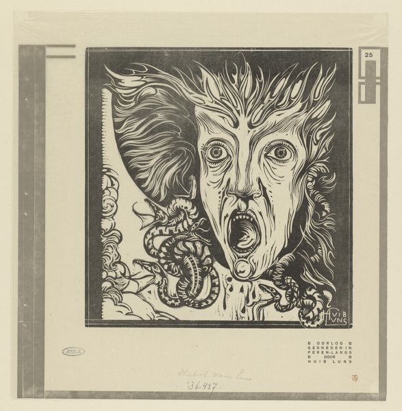 Jac Jongert made this print titled 'Anchor underwater with seaweed' using woodcut techniques. The image presents a stark, yet elegant portrayal of an anchor, transformed by the abstracting currents of the Amsterdam School. This artistic movement, born in the Netherlands in the early 20th century, sought to integrate art with everyday life, imbuing functional forms with expressive qualities. Notice how the anchor, a symbol of stability, is here immersed in the fluid, organic forms of seaweed and water, reflecting the school's wider preoccupation with the sea. Jongert was involved in social-democratic circles, and the Amsterdam School itself was closely tied to socialist ideals, believing in art’s power to uplift the working class. Further research into the political affiliations of Jongert and the patrons of his work would help us understand the image’s social intentions. The meaning of this art lies in this complex interplay between form, politics, and cultural history.