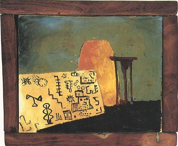 Editor: We're looking at "Rouge et noir," by Roger Bissière, it appears to be an oil painting. The abstract cityscape gives me a feeling of both warmth and constraint. What do you see in this piece, especially considering its reliance on geometric forms? Curator: Geometric forms act as cultural containers, you know. This "cityscape," as you call it, presents a stark contrast. The 'rouge' – red – a colour of passion, energy, even danger – fights against the 'noir' – black – a symbol of the unknown, of mourning. Notice how the rigid shapes of windows and walls seem to imprison that fiery energy. It makes me wonder what narratives, what collective anxieties, this tension represents. What stories simmer behind those darkened windows? Editor: So, the abstractness doesn't negate a narrative, but rather opens it up to broader interpretation? Curator: Precisely. It bypasses concrete storytelling in favour of tapping into shared cultural memories associated with colour and form. A window isn’t just a window; it’s an invitation, a barrier, a portal into the lives of others. Bissière uses these primal visual symbols to stir something deep within us. Does that resonate with you? Editor: It does. I hadn’t thought about how geometric shapes themselves can carry so much symbolic weight, almost like visual archetypes. I find myself wondering about other repeated motifs in art and what they unconsciously tell us about ourselves. Curator: Exactly! It's about unlocking the silent language of images and rediscovering shared cultural consciousness through the symbols we encounter in art. A good way to view historical and contemporary artwork.