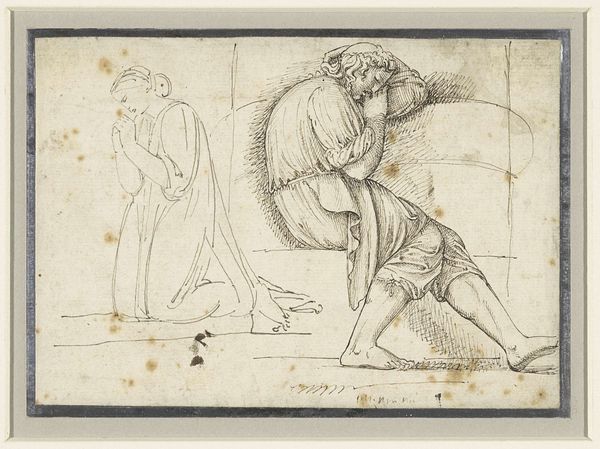 This drawing, "Study for the Wounded Philoctetes," by Nicolai Abildgaard, presents us with a masterclass in the economy of line and form. Executed in pencil, the sheet captures the artist's exploration of the male nude, focusing intently on anatomical precision and expressive posture. The composition centres on a figure, presumably Philoctetes, hunched over, attending to his wounded foot. Abildgaard’s use of line varies in weight and intensity, giving volume and depth to the figure, while other sketches around the central study suggest a broader investigation of poses and movement. The drawing’s formal qualities evoke a sense of classical restraint, consistent with Abildgaard’s Neoclassical inclinations, as the linear precision and the emphasis on the idealised human form. The unfinished nature of the drawing invites us to consider art as a process rather than a fixed object. The visible layers of lines and corrections reveal the artist's thought process, and the piece invites ongoing interpretation.