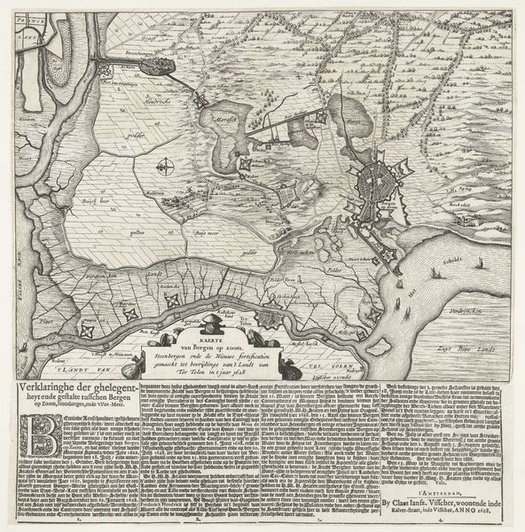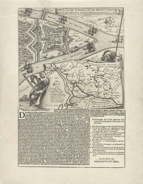 Curator: Take a look at "Overwinning op het Slaak, 1631," which translates to "Victory on the Slaak." This print commemorates a 17th-century naval victory for the Dutch Republic. Editor: It feels incredibly precise, almost like a technical drawing mixed with… well, outright celebration! The density of detail is quite striking. What materials were typically used for prints like this? Curator: Likely etching and engraving on paper, common techniques to mass-produce images. The print served not only as historical record, but also as a potent form of propaganda, bolstering morale and cementing national identity during the Eighty Years' War. Editor: The scale and repetition hint at the labor involved. Looking at the boats—so many individual lines forming sails, hulls, figures… One can't help but wonder about the workshops and the division of labor in creating such imagery for wide distribution. Was this meant for an elite audience, or the common person? Curator: While costly art undoubtedly existed at the time, prints like this were specifically designed to disseminate information and shape public opinion more broadly. The text at the bottom offers a detailed account of the battle, intending to educate and influence. Notice the prominent display of the Dutch coat of arms; such devices drove home the point about the legitimacy and power of the Dutch Republic. Editor: So, beyond depicting ships, landscapes and geometric elements, it is essentially an object born of conflict intended to persuade its viewers? Its social impact is directly linked to its creation and widespread production. This goes far beyond mere aesthetics. Curator: Absolutely. The artist, although unknown, was acting within a specific political context, making choices that would resonate with a particular audience and reinforce a national narrative. "Overwinning op het Slaak" captures more than just a battle; it depicts a nation forging its identity. Editor: Exactly. Examining how materials and printing methods impacted distribution sheds light on a specific socio-political time, connecting technique with social meaning. It offers fascinating insight beyond a single image.