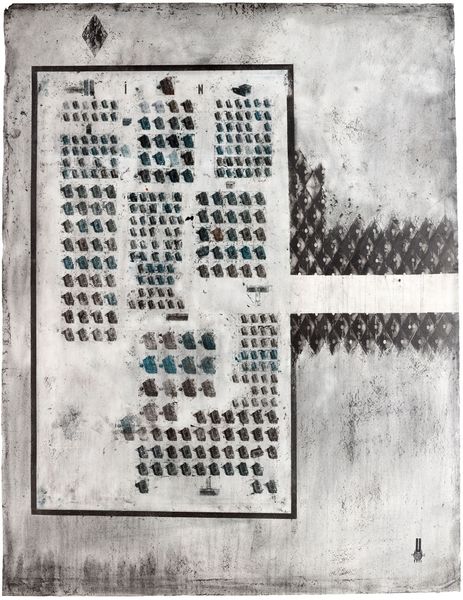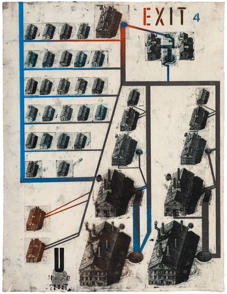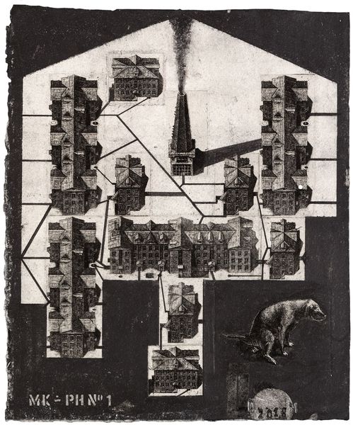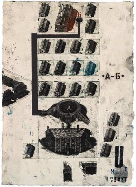 Curator: This work, “City with Freedom Square,” was created by Pavlo Makov in 2021, using ink and digital print on paper. What catches your eye first about it? Editor: A kind of unsettling precision. It looks like a blueprint, but for a soul-crushing urban landscape, almost dystopian with all of those repetitive shapes, each echoing the other, you know? A city that replicates without variation… that’s hardly freedom, is it? Curator: Well, Makov has a keen interest in the structure and the underpinnings of urban environments. To me, there’s a sense of interconnectedness here, like a network of… almost individual lives connected by these very strict lines. Editor: That "freedom square" implied in the title feels incredibly ironic, given the rigid geometry on display. Freedom isn’t usually associated with such regimentation. Is he suggesting our squares, our supposed public spaces, are anything but free? Are they surveilled, controlled? The coldness of the ink suggests surveillance, order, something ominous. Curator: Perhaps. It’s equally fascinating to me how Makov balances precision with… vulnerability. Look at the delicate washes of ink, the imperfections of the paper. The perfect forms want to suggest total control, yet there is also that suggestive small blue dot off to the side. To me it looks as though it may have gotten loose. It softens everything just slightly. Editor: And is it also fair to look at it, in some senses, politically? Thinking of Eastern Europe's experience, does the artwork subtly speak about authoritarian regimes masking themselves as progress? Or even a critique on contemporary urban planning, how so many feel impersonal and isolating? Curator: The artist being Ukrainian definitely makes you wonder if the ideas about order are really about control, whether physical or metaphysical. Either way, the implications are present in the work, if that’s what you are looking for. Editor: Indeed, Makov delivers on so many levels. From architectural rigor to philosophical provocation. What a poignant way to use these stark, industrial lines to get us pondering the very essence of our lived experiences. Curator: Absolutely, it is about how we shape, and are shaped by, our world and what is left that reminds us of what makes us, and it, alive. It stays with you, doesn't it? Editor: Lingers indeed, prompting more questions than it answers, which is always a sign of good art!