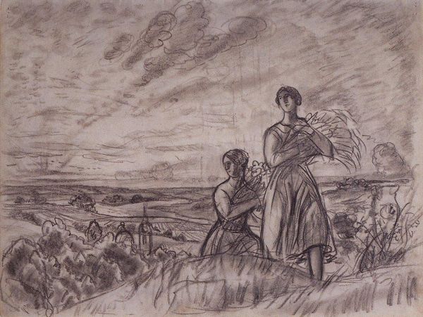 Curator: Let's discuss Camille Pissarro’s "The Tedders." It appears to be a watercolor work and a landscape portraying rural workers. Editor: My first impression is one of lightness and movement. The washes of color create an ethereal quality, suggesting the heat of a summer day and the soft rustling of the field. Curator: Indeed, the atmospheric perspective achieved through the watercolor technique is striking. Notice how the foreground figures, though simply rendered, dominate the composition and draw our eyes into the pictorial space, the orthogonals that the composition delineates, moving towards that red farm complex... Editor: It seems, though, that the composition isn’t just about idyllic scenery. Pissarro clearly intended to capture the physical act of agricultural labor. We can see how the use of this medium makes possible, almost effortless, the depiction of physical exertion and ordinary manual activity, even elevating its importance. Curator: Absolutely. Consider how Pissarro employs form, albeit subtly, to reinforce the figures’ role within the overall design. The shapes of the women almost mirror the haystacks in the foreground. Editor: This medium has clear material implications: Watercolor, because of its inherent immediacy, seems suited to document an equally ephemeral subject and circumstance – workers in the field and changing atmospheric conditions, all intertwined. I would even say, as material things go, that its lightness contributes to the feeling of fleeting time. Curator: That’s a salient point. Pissarro masterfully captures this interplay between temporality and human endeavor. By not dwelling on painstaking accuracy, the artist suggests the transitory nature of the task being undertaken in the painting: haymaking, or "tedding". Editor: Seeing that, what stays with me is Pissarro's clear interest in blending a study of a social situation, one of rural life and ordinary labor, with formal and aesthetic achievements using watercolors, which adds great value to this work. Curator: Yes. The work invites contemplation on several visual and aesthetic relationships— between landscape, figuration, and material engagement with nature. Editor: Indeed; thank you for illuminating the material dynamics and visual richness in "The Tedders.”
